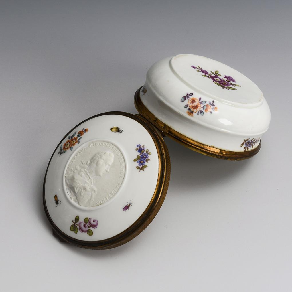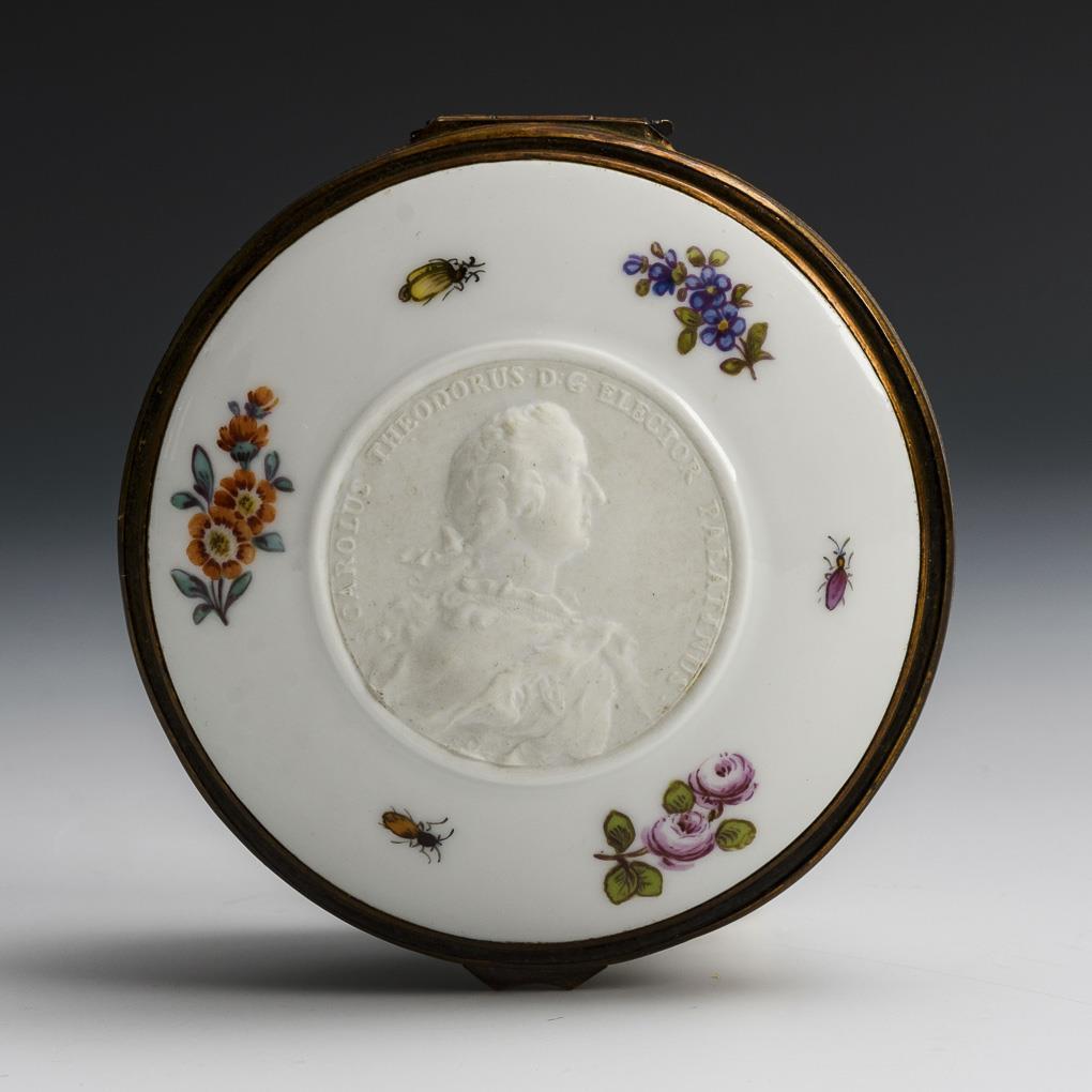 Runde Tabatiere mit metallmontiertem Scharnierdeckel. Allseitig Streublümchen- und Insektenmalerei, auf dem Deckel ein Biskuitmedaillon mit der Reliefdarstellung des pfalz-bayerischen Kurfürsten Karl Theodor von der Pfalz (1724-1799), nach einer anlässlich der Gründung der Akademie der bildenden Künste in Mannheim geschaffenen Medaille, die von dem Medailleur und Stempelschneider Georg Christoph Wächter (1729-1789) entworfen wurde. Bestoßungen am Innenrand des Korpus, Brandriss innen.