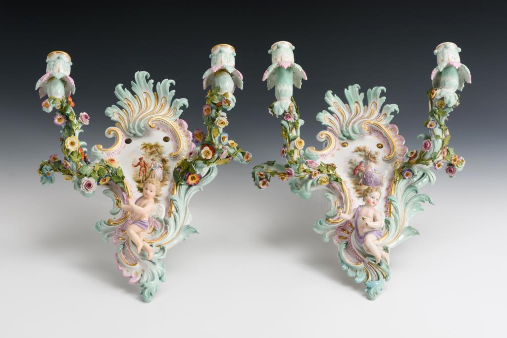Rocailleschild mit zwei, reich mit Blüten belegten Leuchterarmen sowie einem schwebenden Amorknaben. Auf dem Rocailleschild je eine Watteauszene. Partiell Bestoßungen am Belag und Restaurierungen.