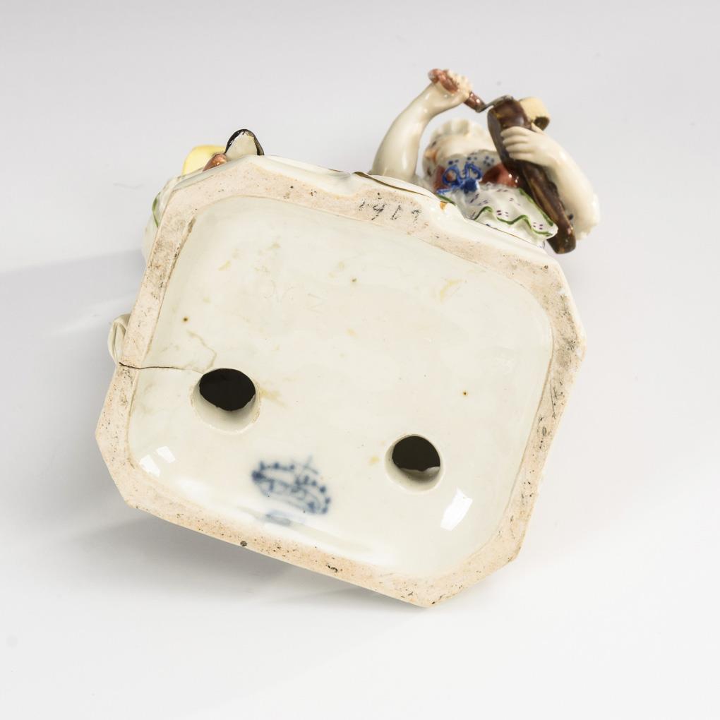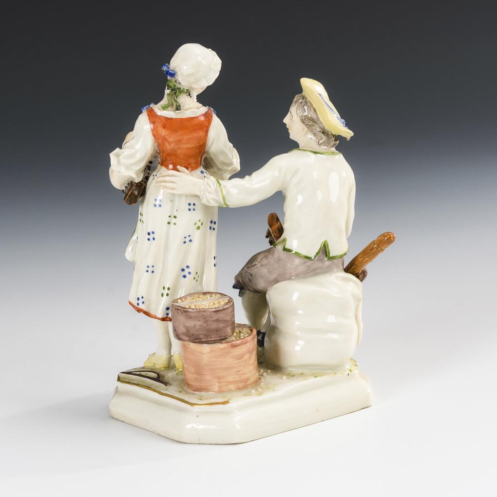Auf einer Rechteckplinthe stehende Bäuerin mit Drehleier sowie auf einem Getreidesack sitzender Bauer mit Flöte. Flöte des Bauern lose anbei, Brandriss am Sockelrand, Restaurierung an der Drehleier, am Stock und Hut des Bauern.