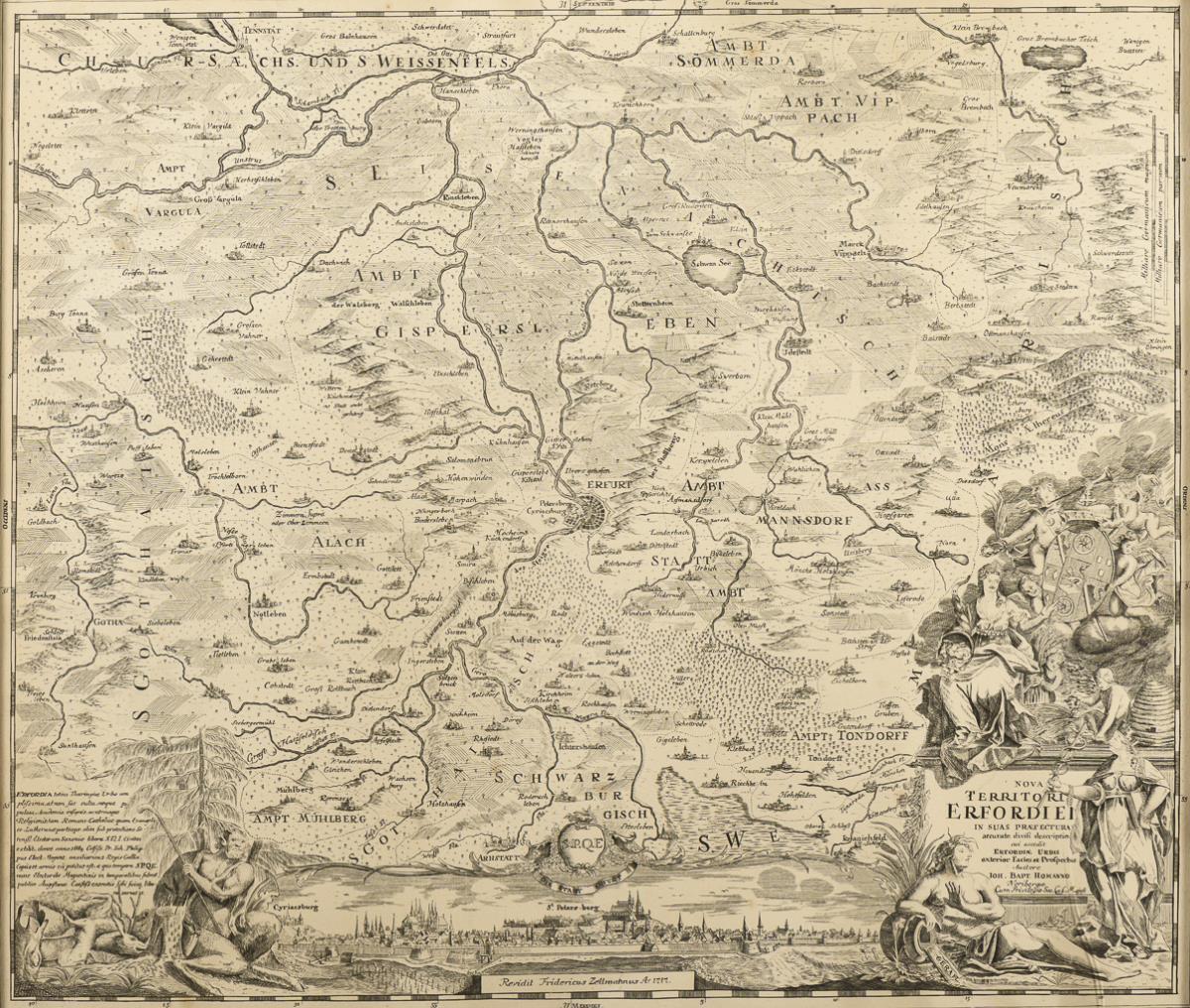 Detailreiche historische Karte der Region um Erfurt, mit Ämtern und Vogteien; figürliche Titelkartusche "Nova Territorii Erfordiensis in suas Praefecturas [...]", Beikartusche mit Begleittext in lateinischer Sprache und Gesamtansicht von Erfurt, Revisionsvermerk des Kartografen Friedrich Zollmann von 1717 | Nachtrag 05.10.2022: wohl jüngerer Nachdruck. Minimal stockfleckig.