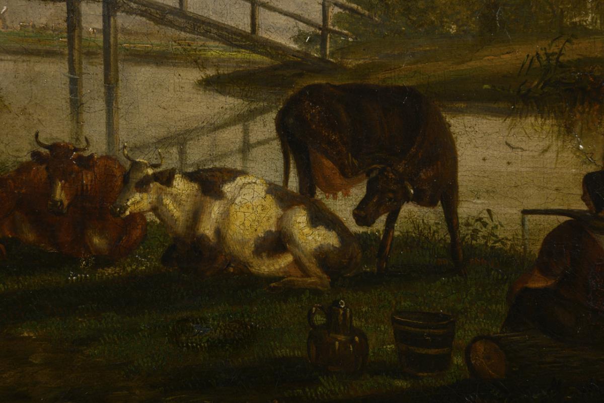 Dorflandschaft mit Windmühle sowie Personen mit dem Vieh nahe dem Flussufer. Restauriert mit Hinterklebungen.