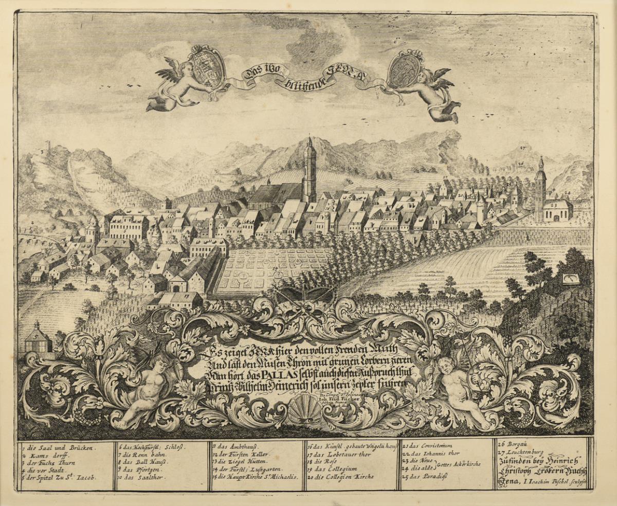 Historische Gesamtansicht der Stadt Jena, mit Titelkartusche "Das itzo blühende Jena" und Legende, dazu Begleittext "Es zeiget JENA hier den vollen Freuden Muth Und läst den Musen Thron mit grünen Lorbern zieren Man hört, das PALLAS selbst auch diesen Außpruch thut Printz Wilhelm Heinerich sol unsern Zepter führen", darunter "Ita Compos:e. delineavit Ioh. Frid. Fischer. Ostheim. Franco Math. Studi". Etwas stockfleckig.