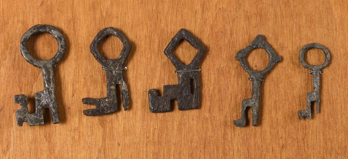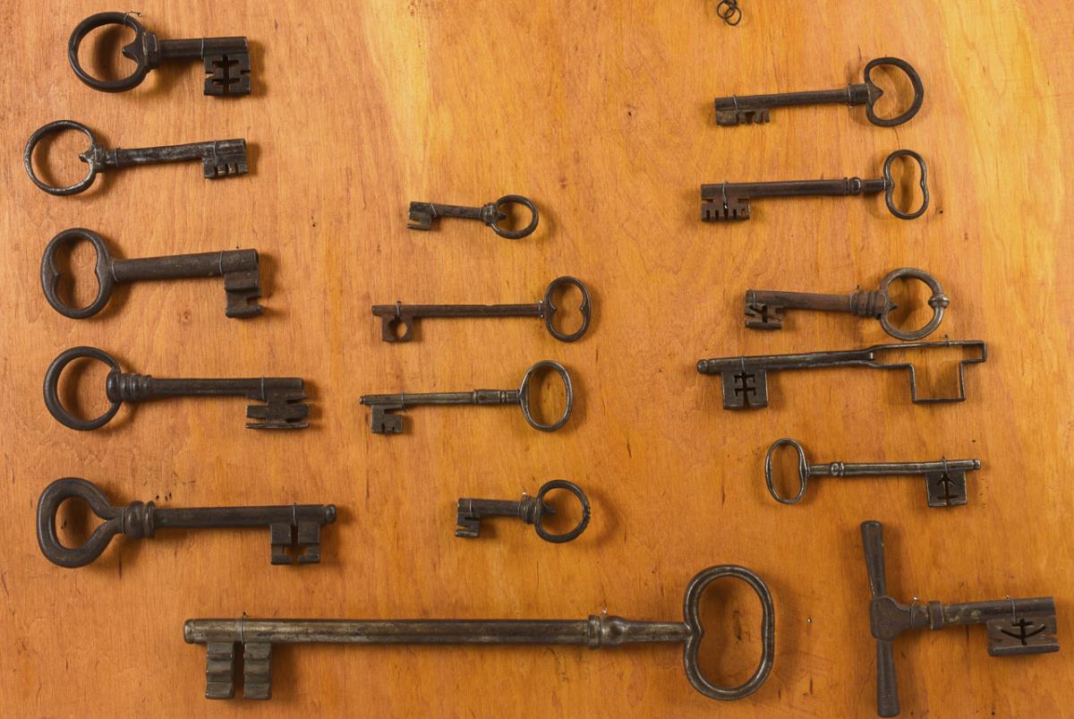 Paar barocke Türbänder, 1 barockes Kastenschloss mit getriebener Messing-Schlossdecke und Wächter, 1 Truhenschloss (Zangenschloss), zahlreiche Schlüssel (Gotik bis 19. Jh., darunter 1 Klappschlüssel. Teils starke Alters-/Gebrauchsspuren.