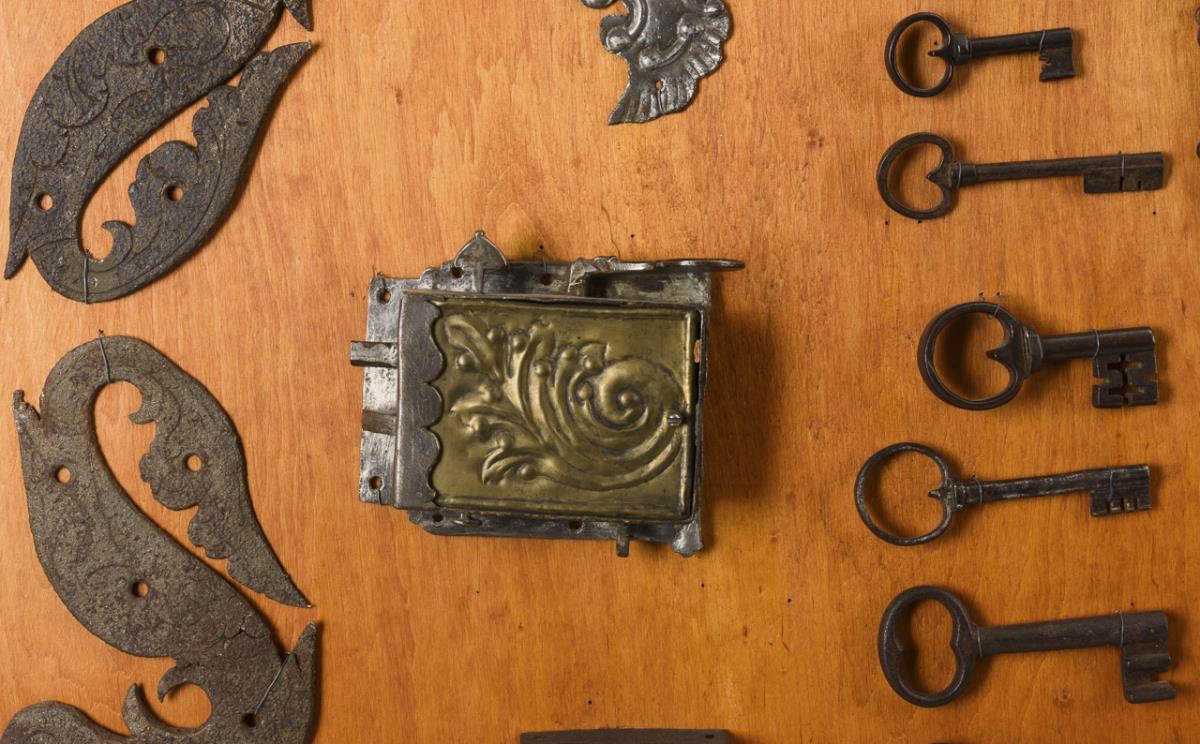 Sammlungs-Schautafel mit Schlüsseln, Schlössern, Beschlägen und Teil eines Kettenhemdes.