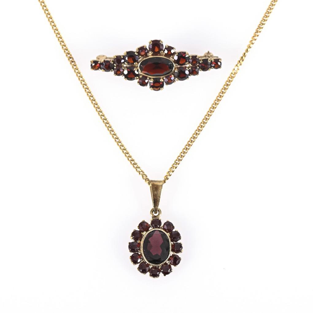Anhänger und Broschen mit Granatbesatz. Panzerkette mit Ringfederschließe.