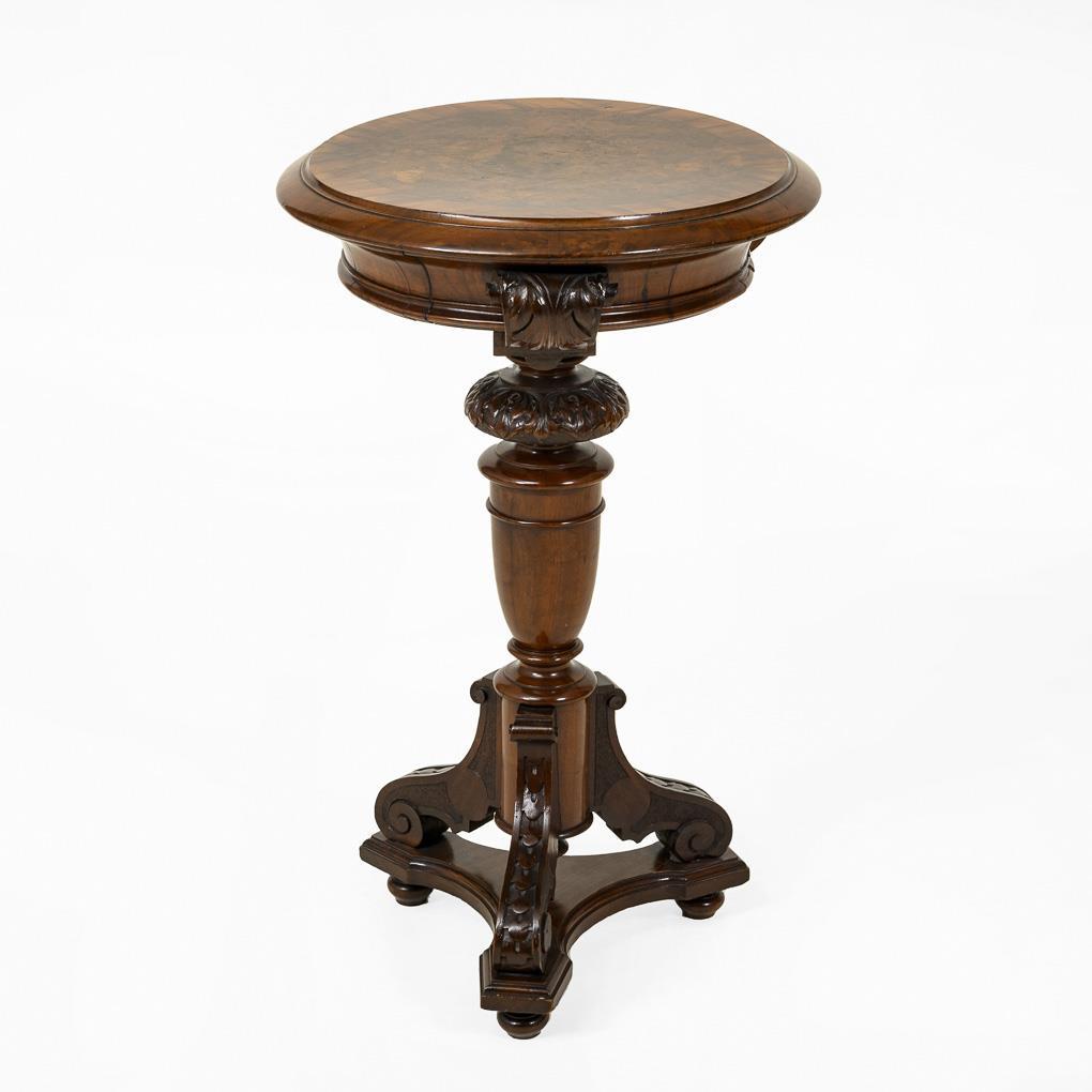 Kleiner runder Beistelltisch auf Mittelstütze, mit 3 volutierten Füßen und dreipassig geformtem Sockelbrett, dekoriert mit Maserfurnier und Reliefschnitzereien. Restauriert, leichte Alters-/Gebrauchsspuren.
