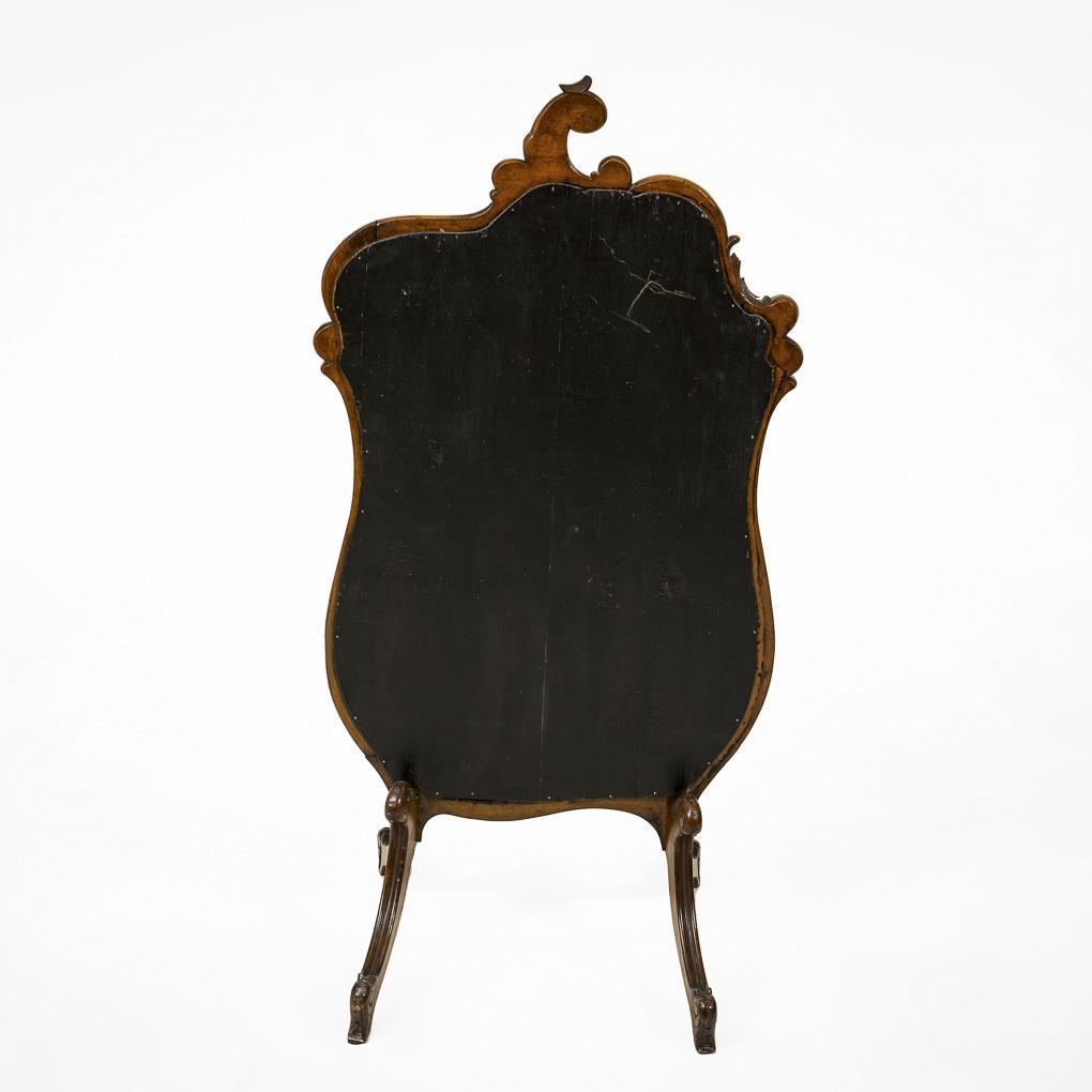Ofenschirm in barocker Formgebung auf seitlichen Brückenfüßen mit Voluten, bekrönt mit Rocaillenschnitzerei; Stoffbespannung mit gemalter galanter Szene, verso ebonisierte Holzverkleidung. Leichte Alters-/Gebrauchsspuren, restauriert.