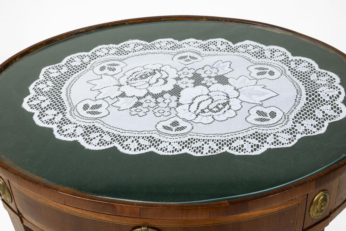 Schlichter ovaler Salontisch auf 4 Pfeilerbeinen, mit 1 Zargenschub und eingelegter Glasplatte, dezent dekoriert mit Messingapplikationen. Alters-/Gebrauchsspuren, restauriert.