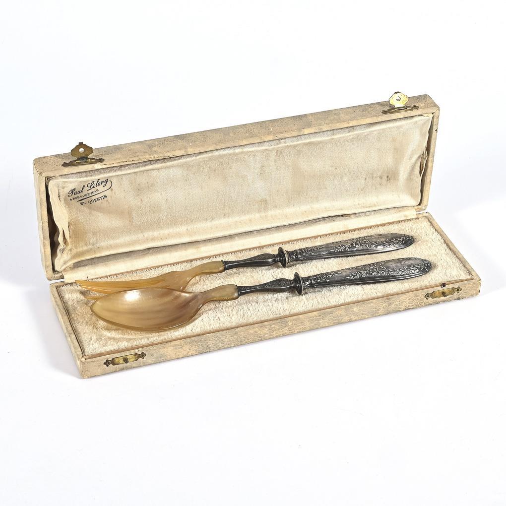Löffel und Gabel aus Horn, mit floral reliefierten Silbergriffen. In originaler Schatulle, mit Originalrechnung von 1916. Gebrauchsspuren, Füllung an den Griffansätzen sichtbar.
