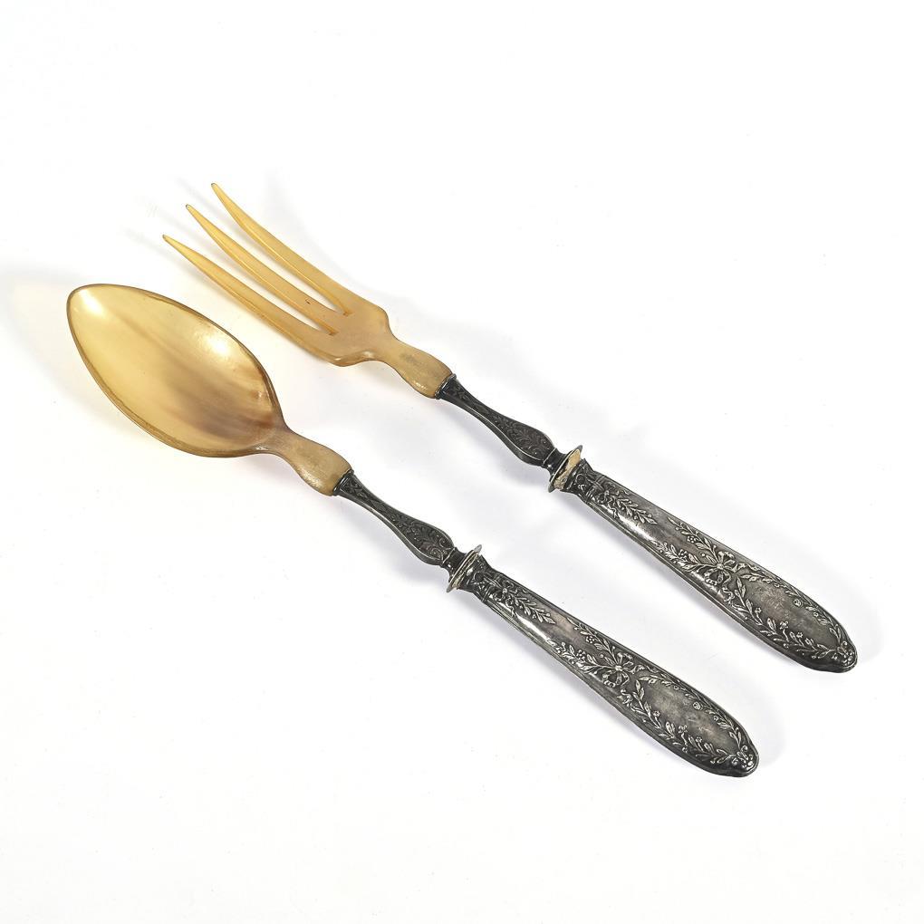 Löffel und Gabel aus Horn, mit floral reliefierten Silbergriffen. In originaler Schatulle, mit Originalrechnung von 1916. Gebrauchsspuren, Füllung an den Griffansätzen sichtbar.