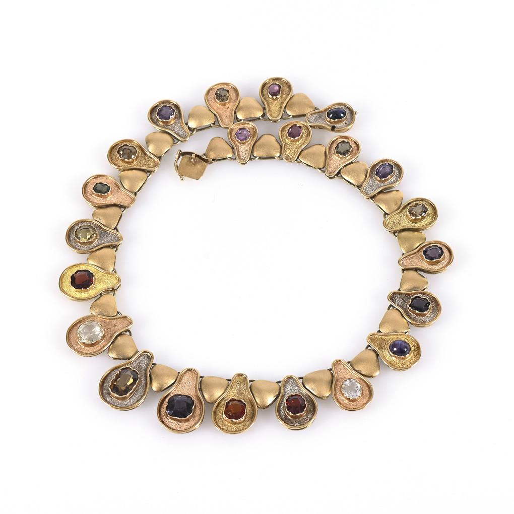 Tropfenförmige Zierglieder im leichten Verlauf, besetzt mit zargengefassten Steinen (u.a. Saphir, Amethyst, Rauchquarz, Granat, Aquamarin, Turmalin, Citrin), zwischen satinierten Gliedern, an Kastenschloss mit Achtersicherung.