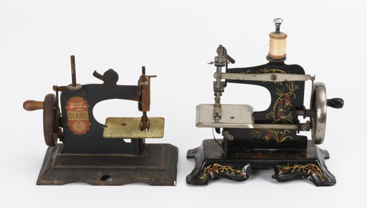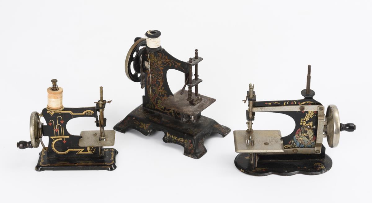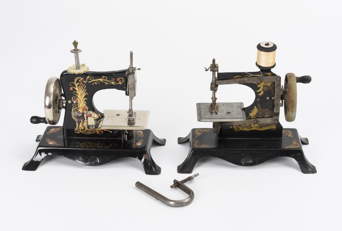 Schwarze Nähmaschinen mit farbigen Litographie-Motiven. Verschiedene Modelle. Alle bespielt, teils mit starken Altersspuren.
