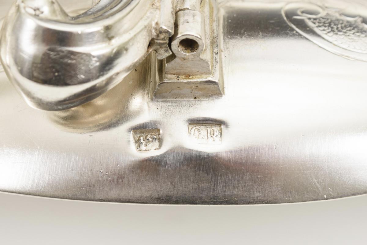 Reich reliefierte und gravierte Schale mit Scharnierhenkel.