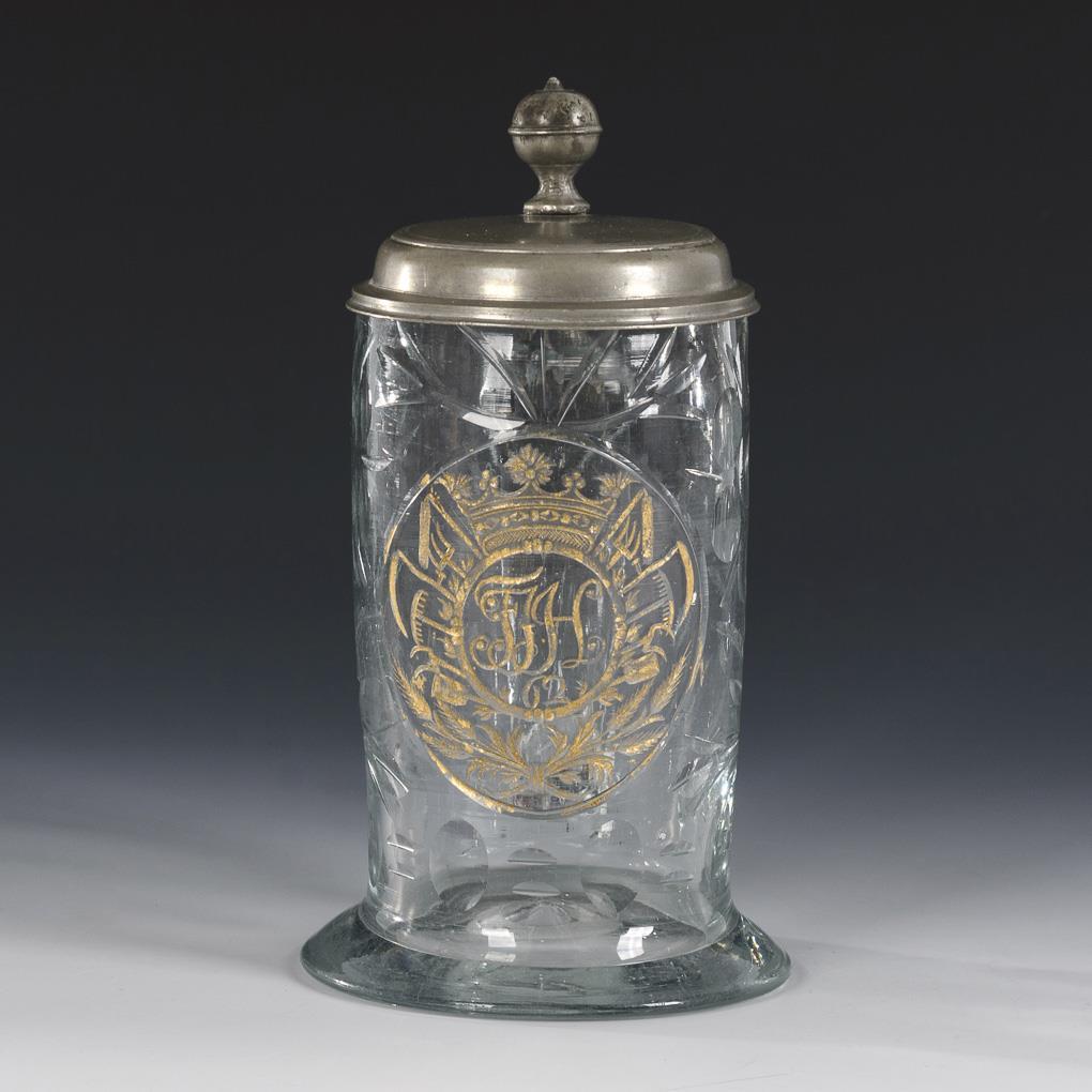 Walzenkrug mit breitem Stand, Bandhenkel und zinnmontiertem Deckel mit Kugeldrücker. Schauseitig ein graviertes und goldstaffiertes Medaillon mit dem bekrönten Monogramm "FJH", umgeben von Sensen, Rechen, Heugabeln und Dreschflegeln, verso Kerb- und Linsenschliffdekor. Beriebene Goldstaffage.