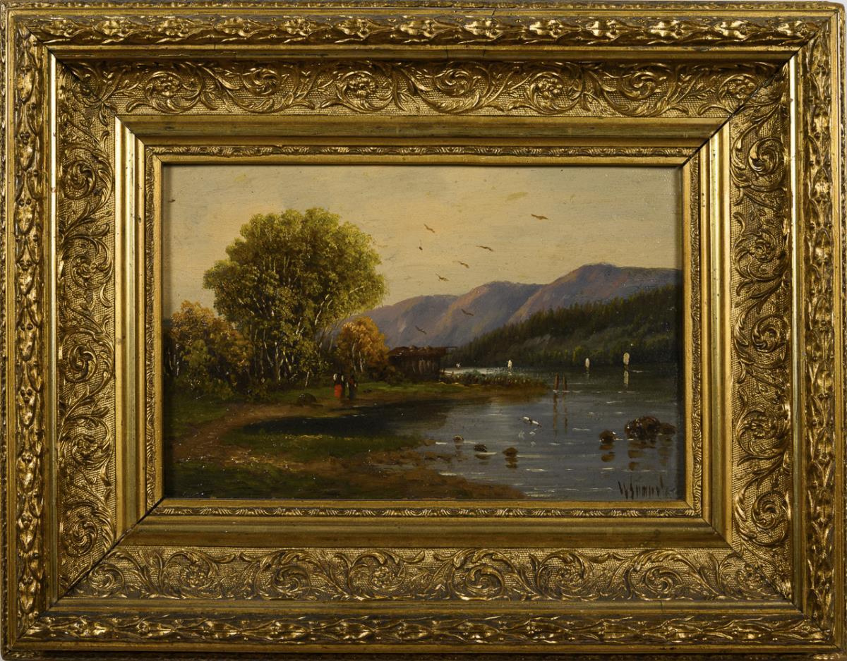 Hütte am Fluss mit nahenden Personen und Blick zu den Seglern nahe dem Wald am anderen Ufer. Leichte Altersspuren.