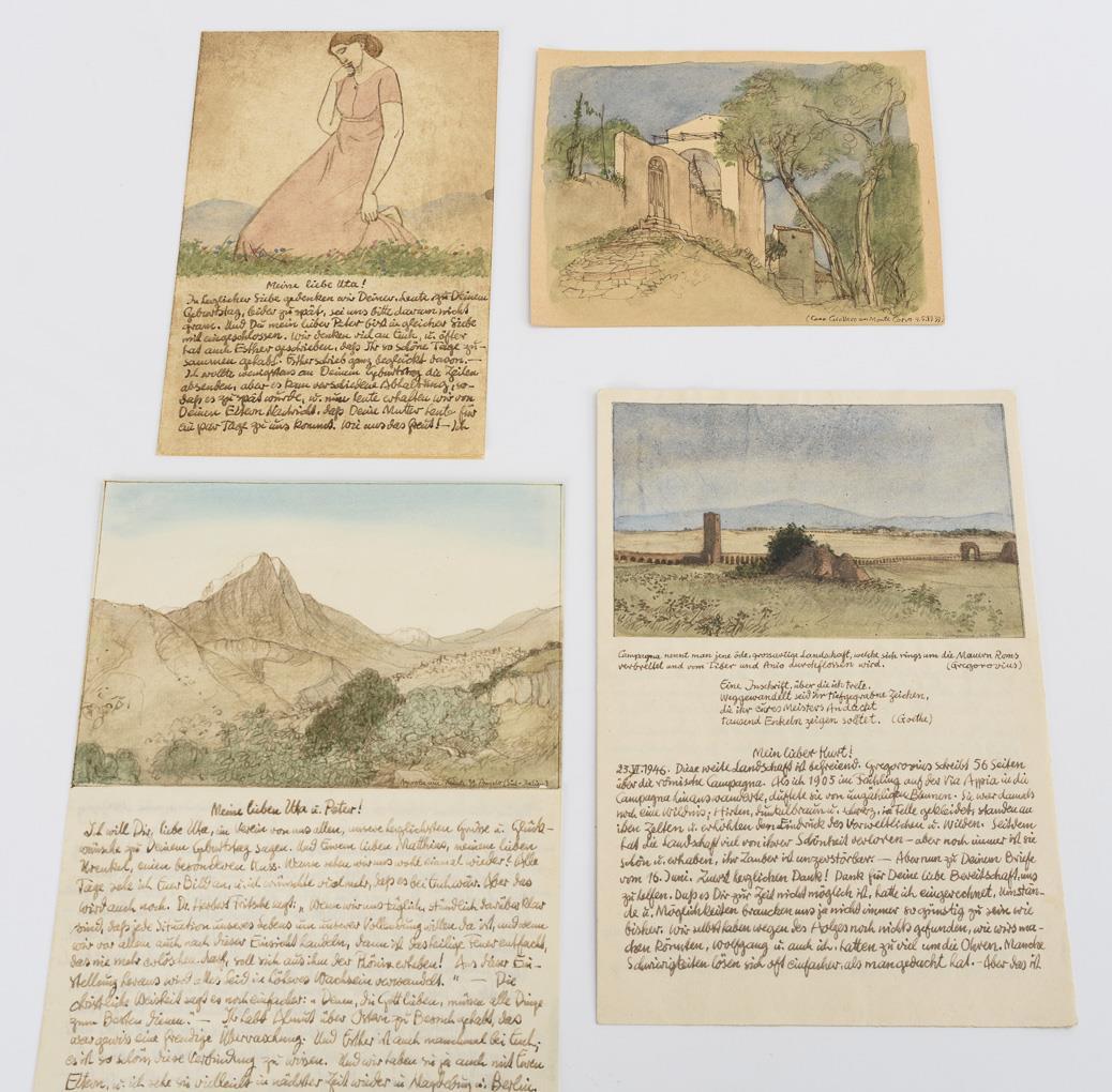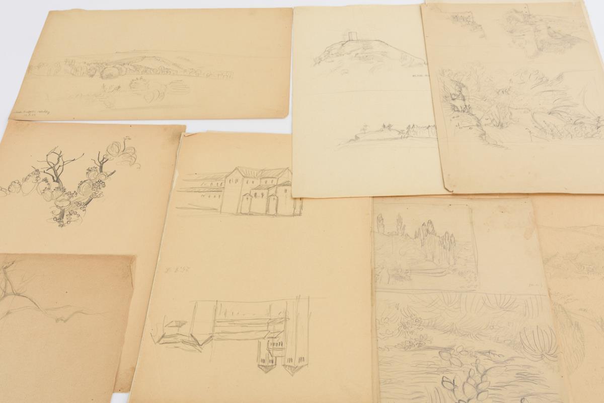 Gerahmte Bleistiftzeichnung "Salzachstrasse 2" (Rahmen: 32 x 28 cm), 2 gerahmte Ansichten von Hohenferchesar, davon 1x Tuschzeichnung, datiert "16.VI.51" und signiert (Rahmen: 35 x 52 cm) und 1x Bleistiftzeichnung, datiert "16.VI.51" und signiert (Rahmen: 32 x 46,5 cm), etwas stockfleckig; Mappe mit 7 Briefen des Künstlers aus den 1940er und 1950er Jahren, davon 5 mit Landschaftsaquarell, 1 mit Damenbildnis und 1 mit Darstellung einer Grabstätte; Aquarell mit Ruinenlandschaft "Casa Giollaro am Monte Corro 4.5.1939" und Aquarell mit Berglandschaft (unleserlich betitelt, 30.8.1939) sowie 18 Blättern mit Bleistiftskizzen aus den 1920er Jahren mit Landschaften, Skizzen knickspurig, Löcher in den Ecken durch Pin-Befestigung, teils etwas fleckig.