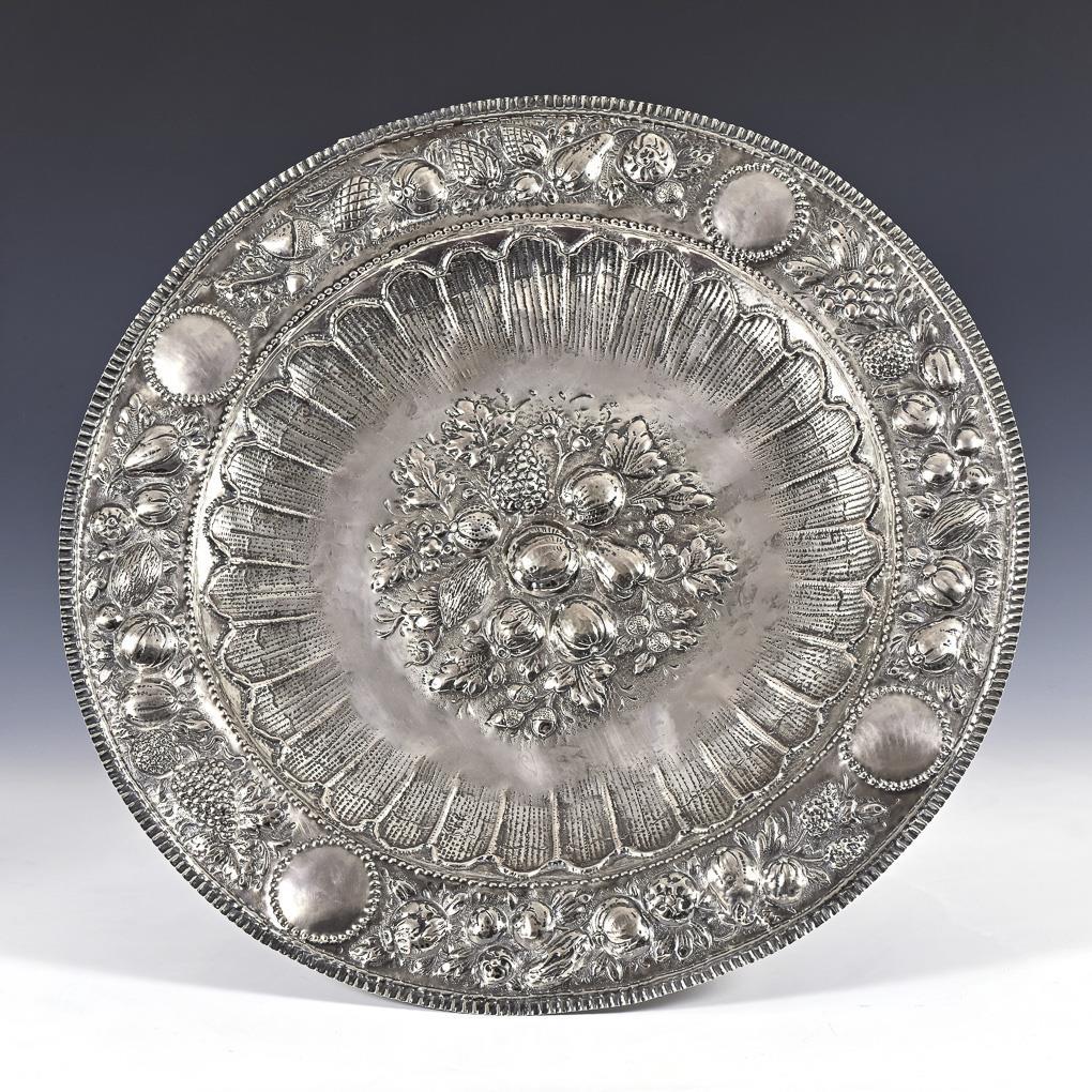 Große silberne Schauplatte mit Fruchtreliefs.