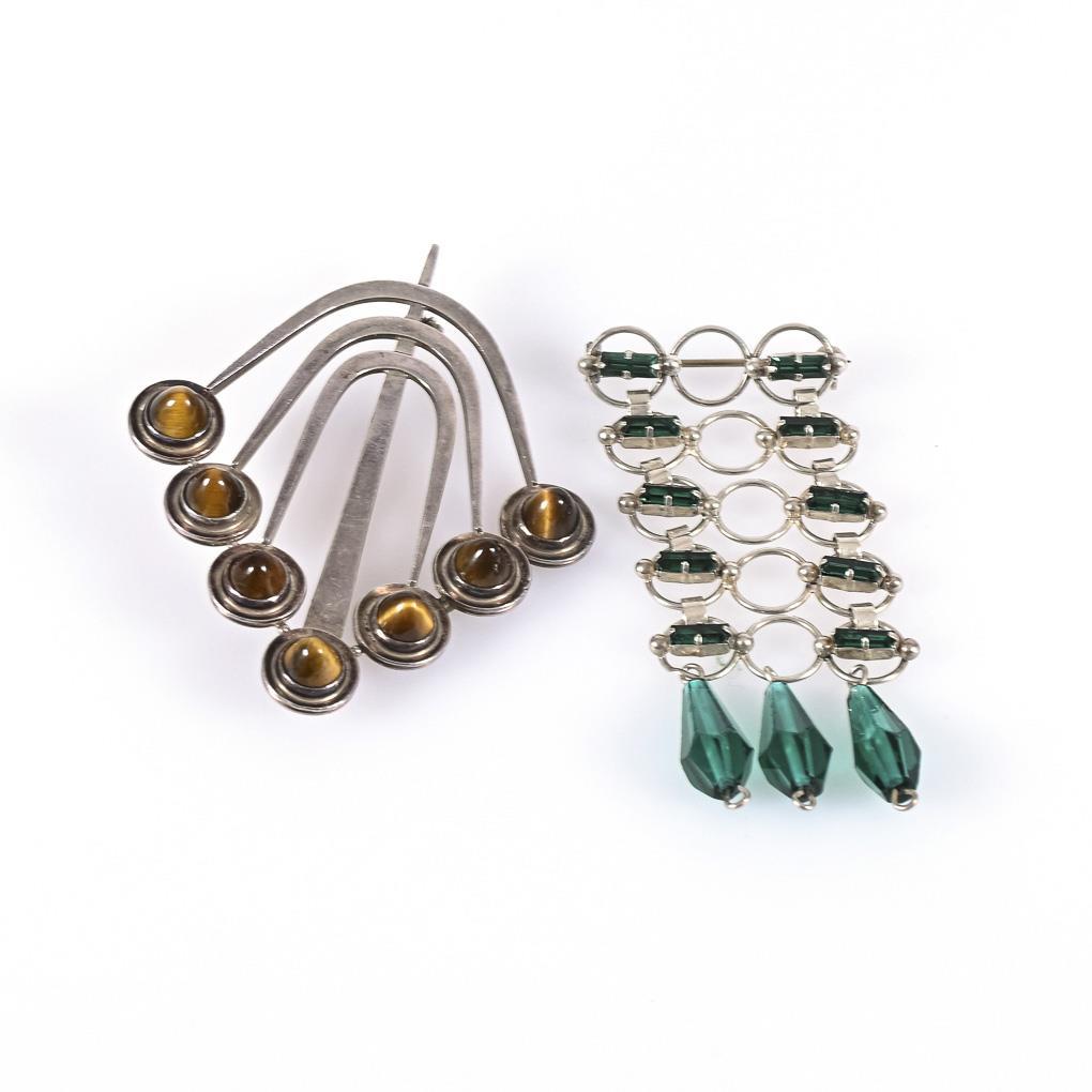 Ringbrosche mit krappengefassten und abgehängten Glassteinen. Brosche mit Tigeraugencabochons in offenen Zargenfassungen. Ringfederschließen.