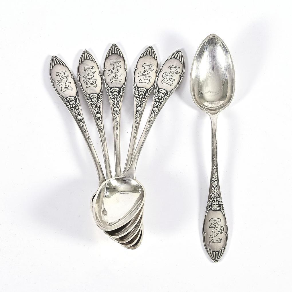 6 Löffelchen mit reliefiertem Engelskopf, Monogrammgravur "JG" und Datierung "1934". Minimale Gebrauchsspuren, Etui mit Abriebspuren.