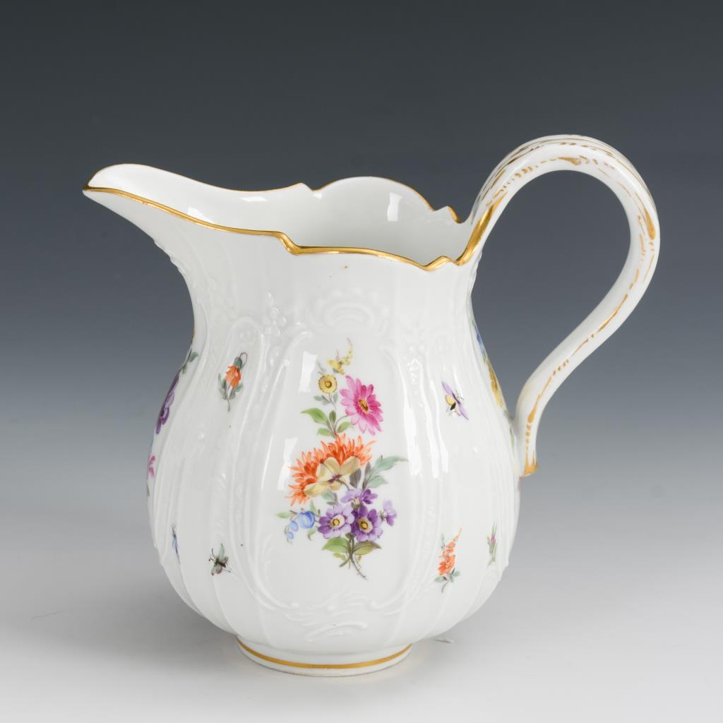 Birnkännchen mit Rocaillerelief und Blumenmalerei.