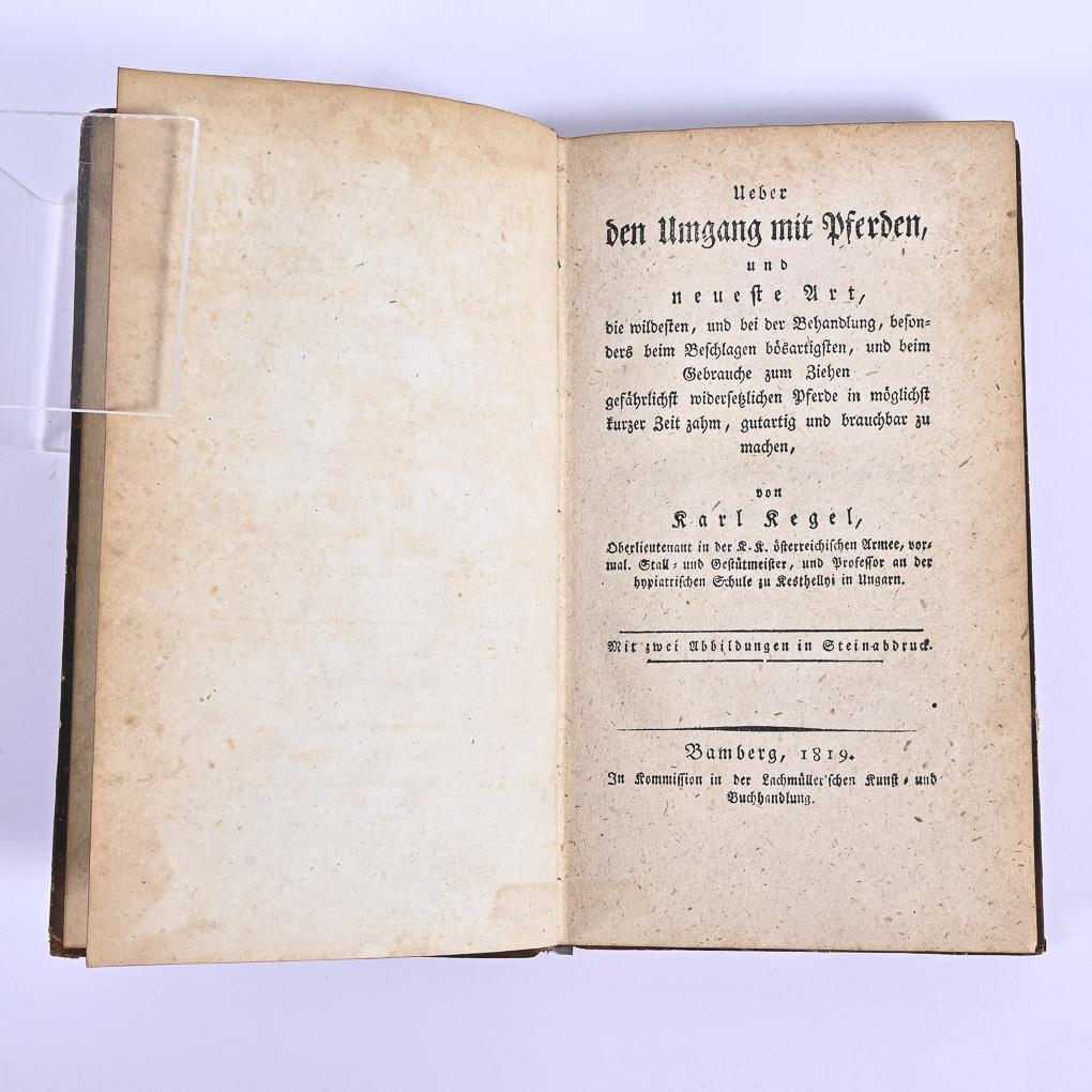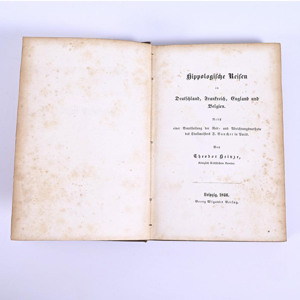 August Conrad Havemann: "Anleitung zur Beurtheilung des äußern Pferdes, in Beziehung auf dessen Gesundheit und Tüchtigkeit zu verschiedenen Diensten", Hannover 1805, 295 Seite. /Karl Kegel: "Ueber den Umgang mit Pferden und neueste Art, ... brauchbar zu machen", Bamberg 1819, 206 Seiten und 2 Tafeln. / Theodor Heinze: "Hippologische Reisen in Deutschland, Frankreich, England und Belgien. Nebst einer Beurtheilung der Reit- und Abrichtungsmethode ...", F. Baucher in Paris, Leipzig 1846, 173 Seiten. Alle mit altersgemäßen Gebrauchsspuren.