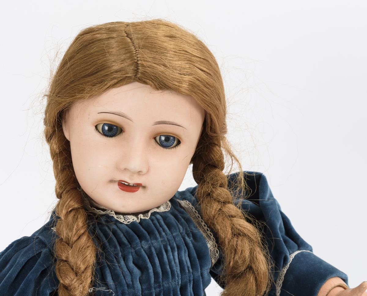 Gespritzter Kurbelkopf, blaue Schlafaugen, mittelblonde Kunsthaarperücke. 11-teiliger Gliederkörper. Blaues Samtkleid, schwarze Lackschuhe. Haarriss am Hinterkopf, Kopfkrone mit minimalen Bestoßungen. Körper mit Farbdefekten, Mittelfinger links fehlt.