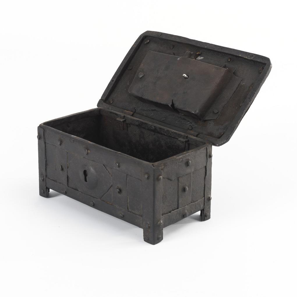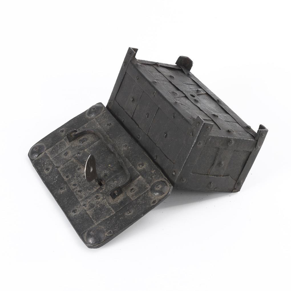 Truhenfömige Schatulle mit allseits aufgenieteten Verstärkungsbändern und tordiertem Tragegriff. Scheinschlüsselloch in der Front, verdecktes Schlüsselloch im Scharnierdeckel, im Boden verdecktes Bohrloch. Schlichte Schlossabdeckung im Deckel. Teils starke Alters-/Gebrauchsspuren.