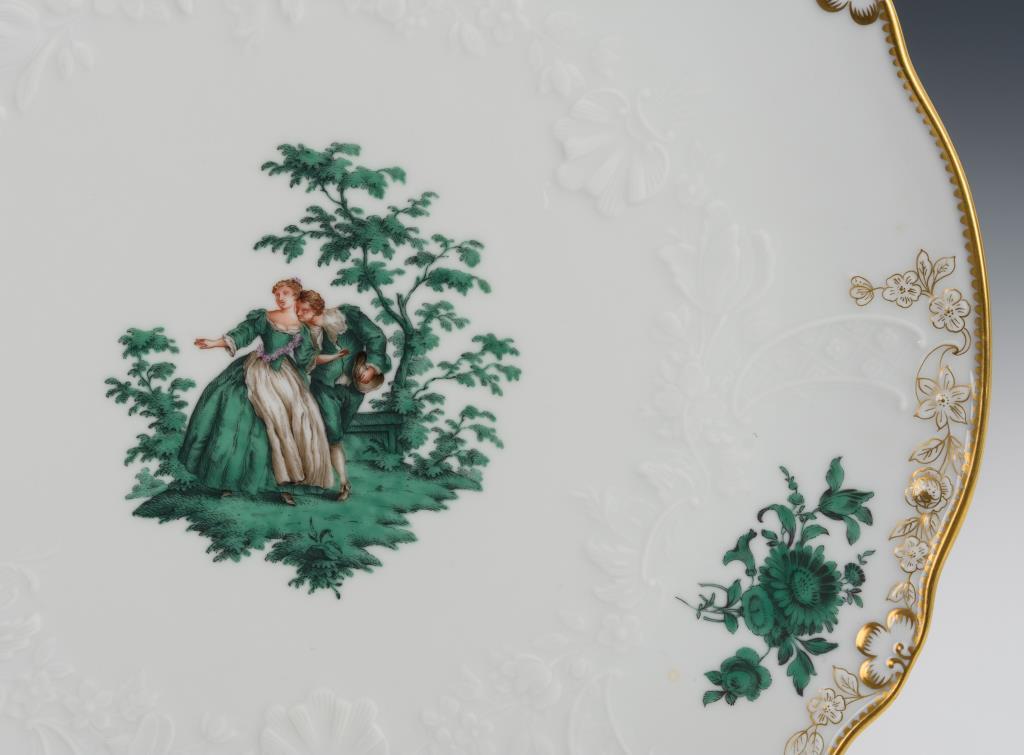 Kupfergrüne, teils farbige Watteaumalerei und Blumenmalerei, goldstaffiert.ø 32,5 cm.