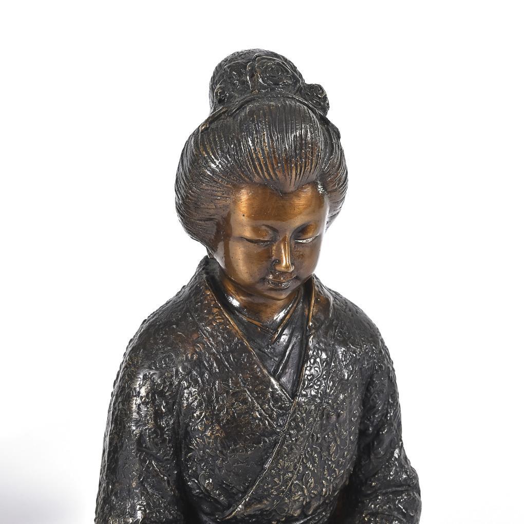 Zwei Figuren einer knienden Frau und eines knienden Mannes, beide im Kimono, er mit zwei Schwertern im Obi. Fein reliefierte Oberfläche.