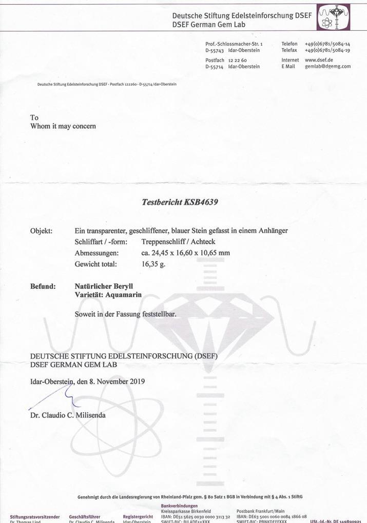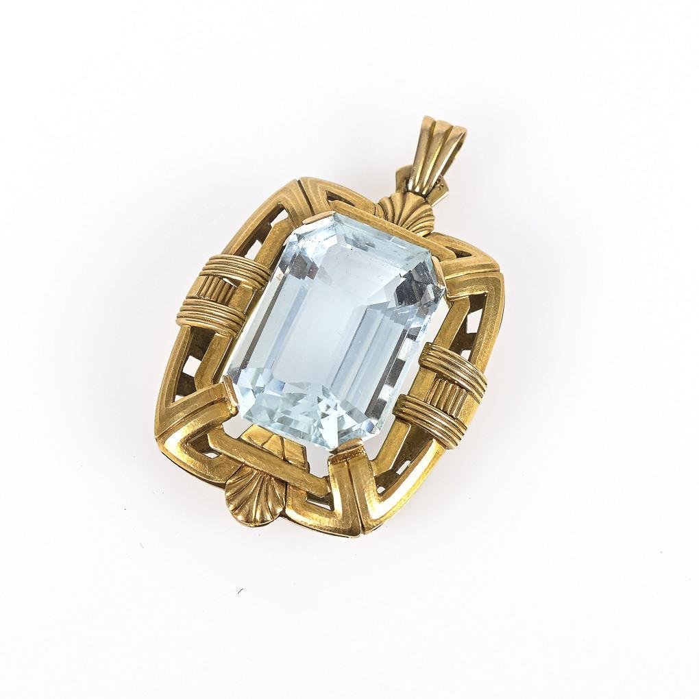 Gelbgold 585 gestempelt. 4 x 3 cm. Aquamarin 24,45 x 16,60 x 10,65 cm. 16,3 g.