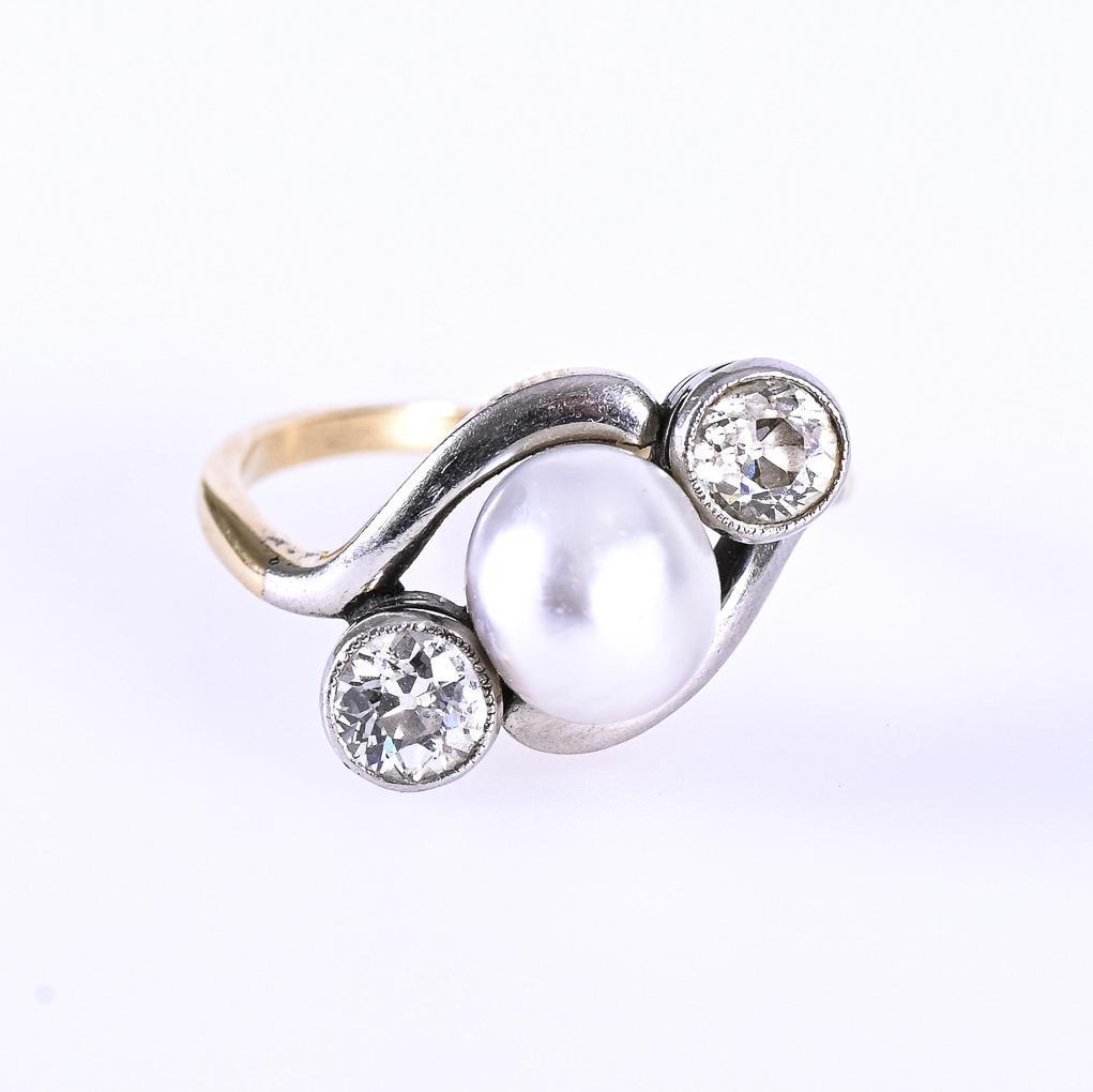 Art-déco-Ring mit Altschliff-Brillanten und Zuchtperle.
