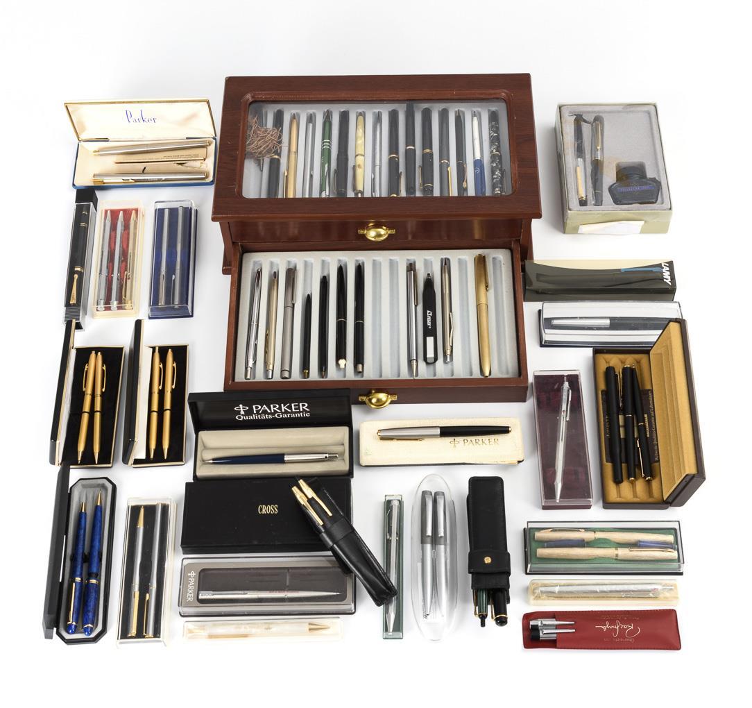 Ca. 70 Schreibgeräte (Kugelschreiber, Minenhalter, Patronen- und Kolbenfüller). Ca. 8x Parker, 2x Pelikan, 2x Cross mit 2 Minen im Etui, sowie Geha, Lamy, Diplomat, Senator usw.. Teils in 2-schübiger Schatulle in Holzoptik und mit Sichtfenster. Teils Alters-/Gebrauchsspuren.