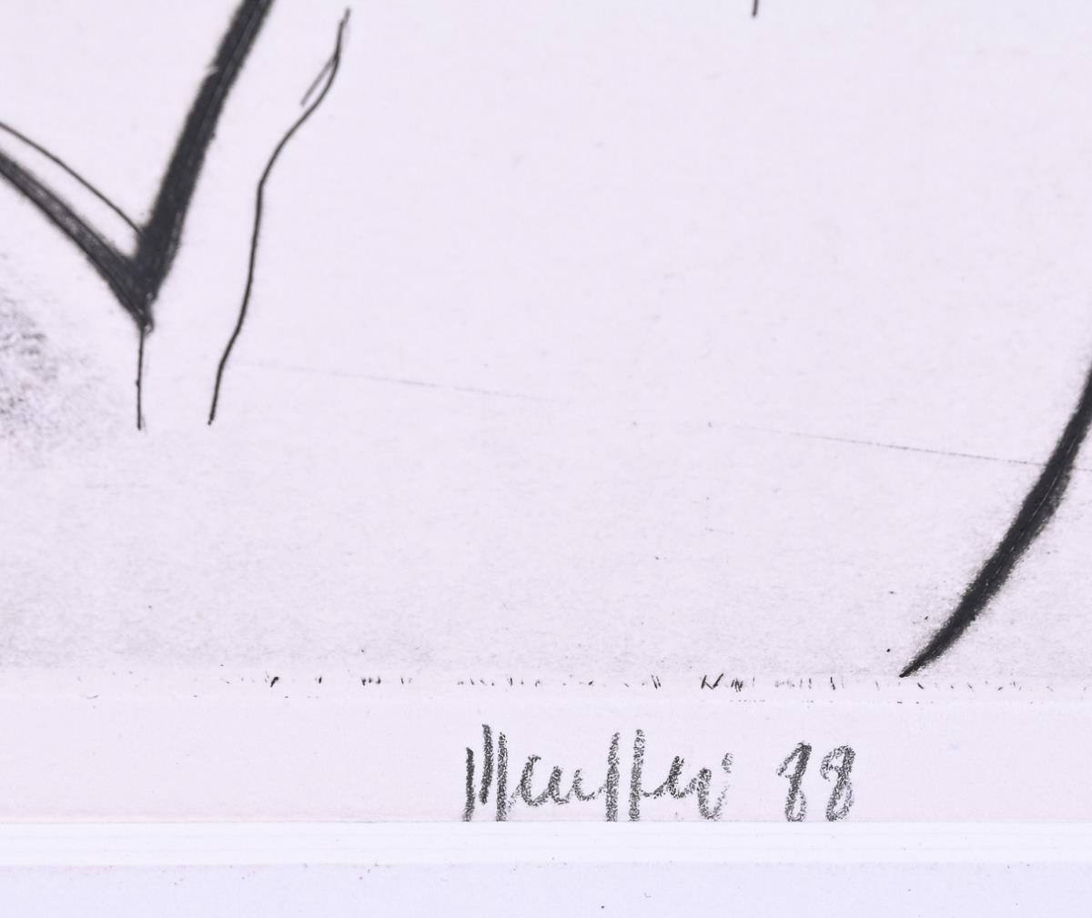 Undeutlich signiert: Liegender weiblicher Akt, Radierung auf Bütten, Bleistiftsignatur, Exemplar: 3/10, Platte: 13 x 16,3 cm, Blatt: 16 x 19,7 cm, auf Karton montiert: 27 x 37 cm | Monogrammist "Bk.": Liegender weiblicher Akt, Lithografie, Bleistiftsignatur, Exemplar: 47/50, [19]84, Blatt: 21,2 x 21,2 cm, auf Karton montiert: 26 x 37,5 cm | Undeutlich signiert: Liegender weiblicher Akt, Radierung auf Bütten, Bleistiftsignatur, [19]88, Exemplar: 57/80, Platte: 24,5 x 30,5 cm, Blatt: 59,5 x 49,5 cm, im Passepartout: 70 x 50 cm.