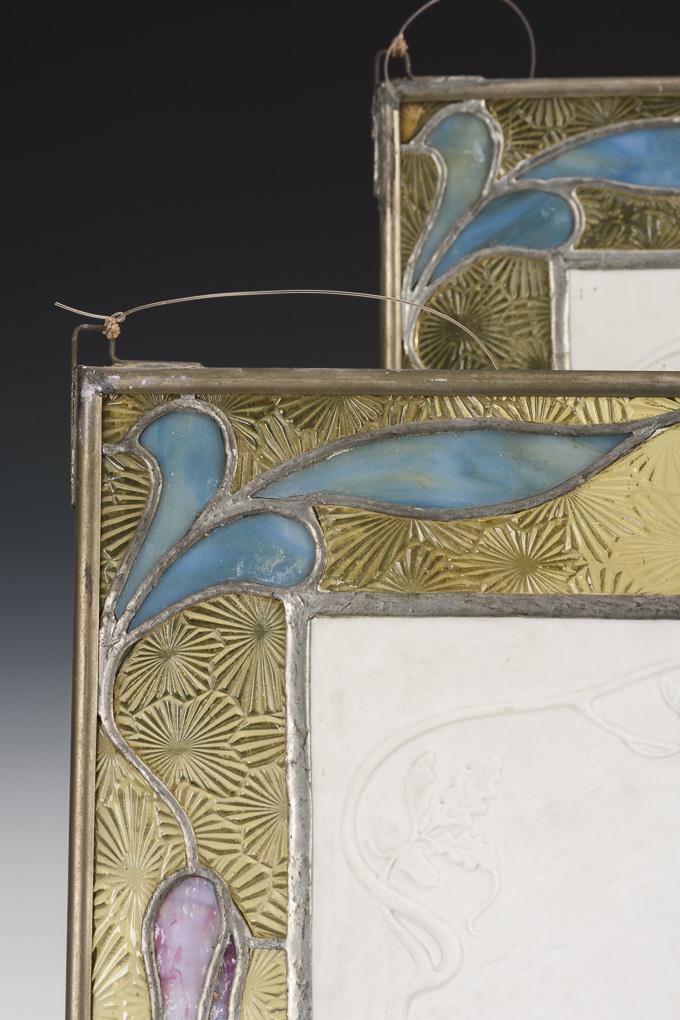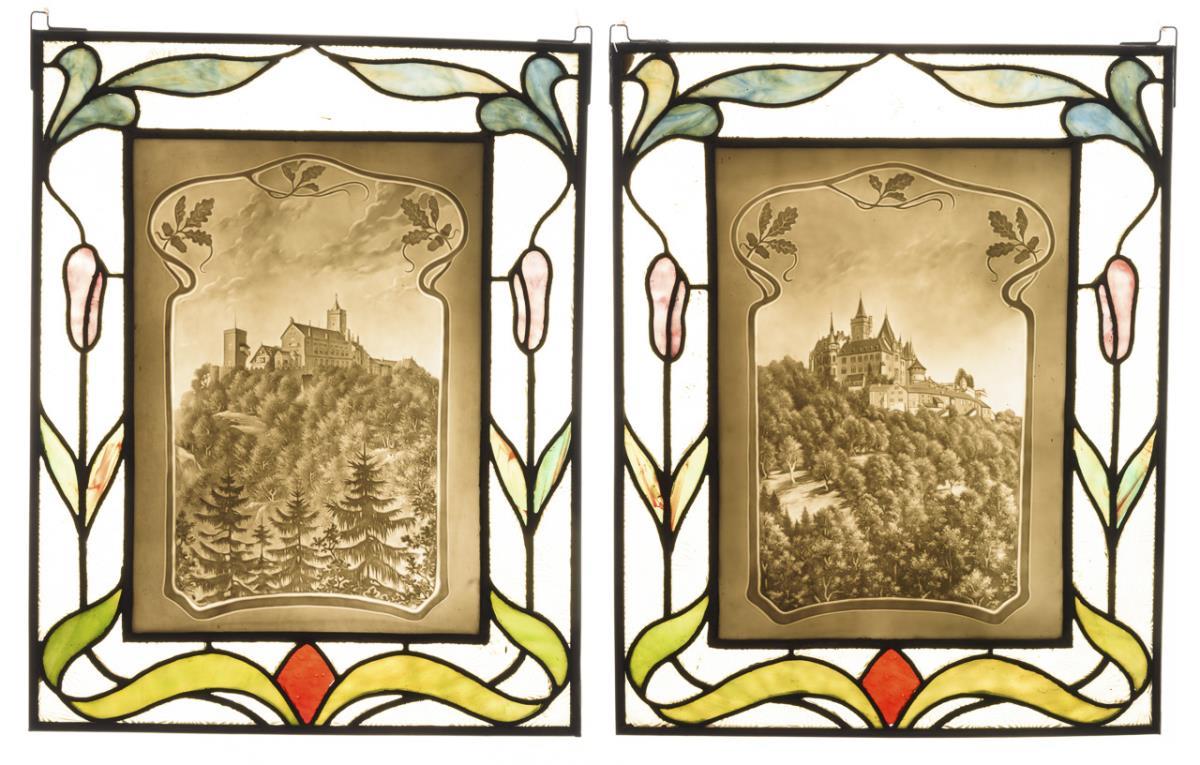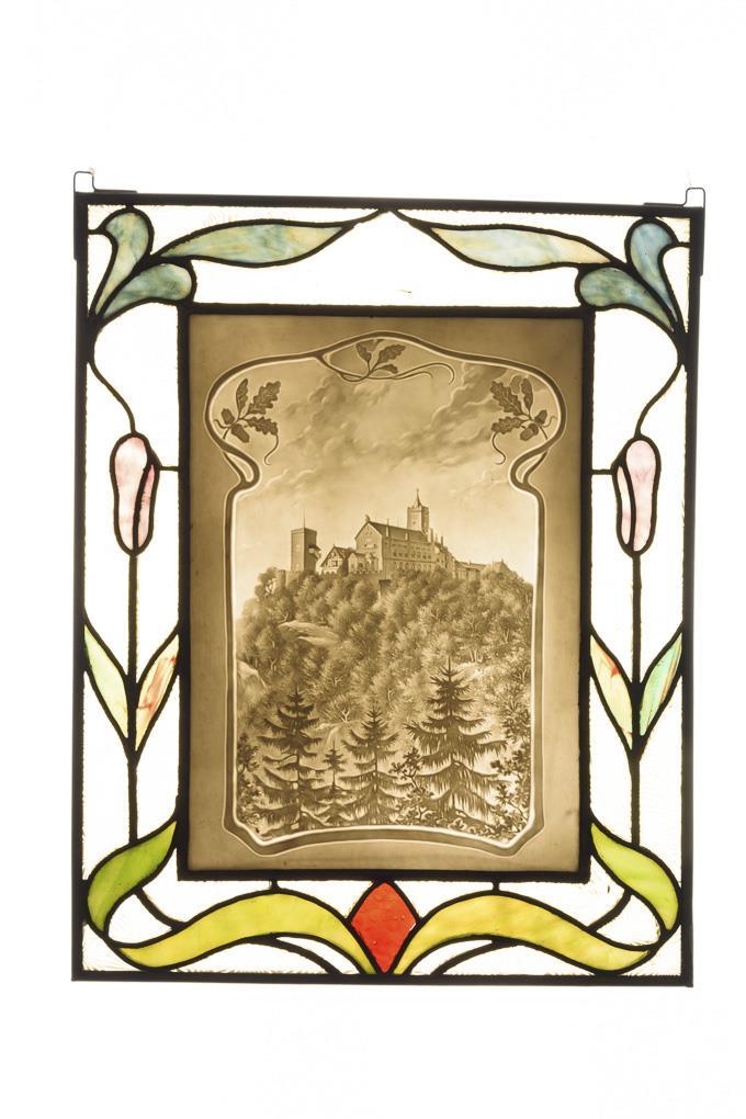Rechteckige Lithophanien mit der Darstellung der Wartburg in Eisenach bzw. des Schlosses Wernigerode, gerahmt von einem floral gestalteten Bleiglasrahmen. 1 Glasscheibe mit Spannungsrissen.