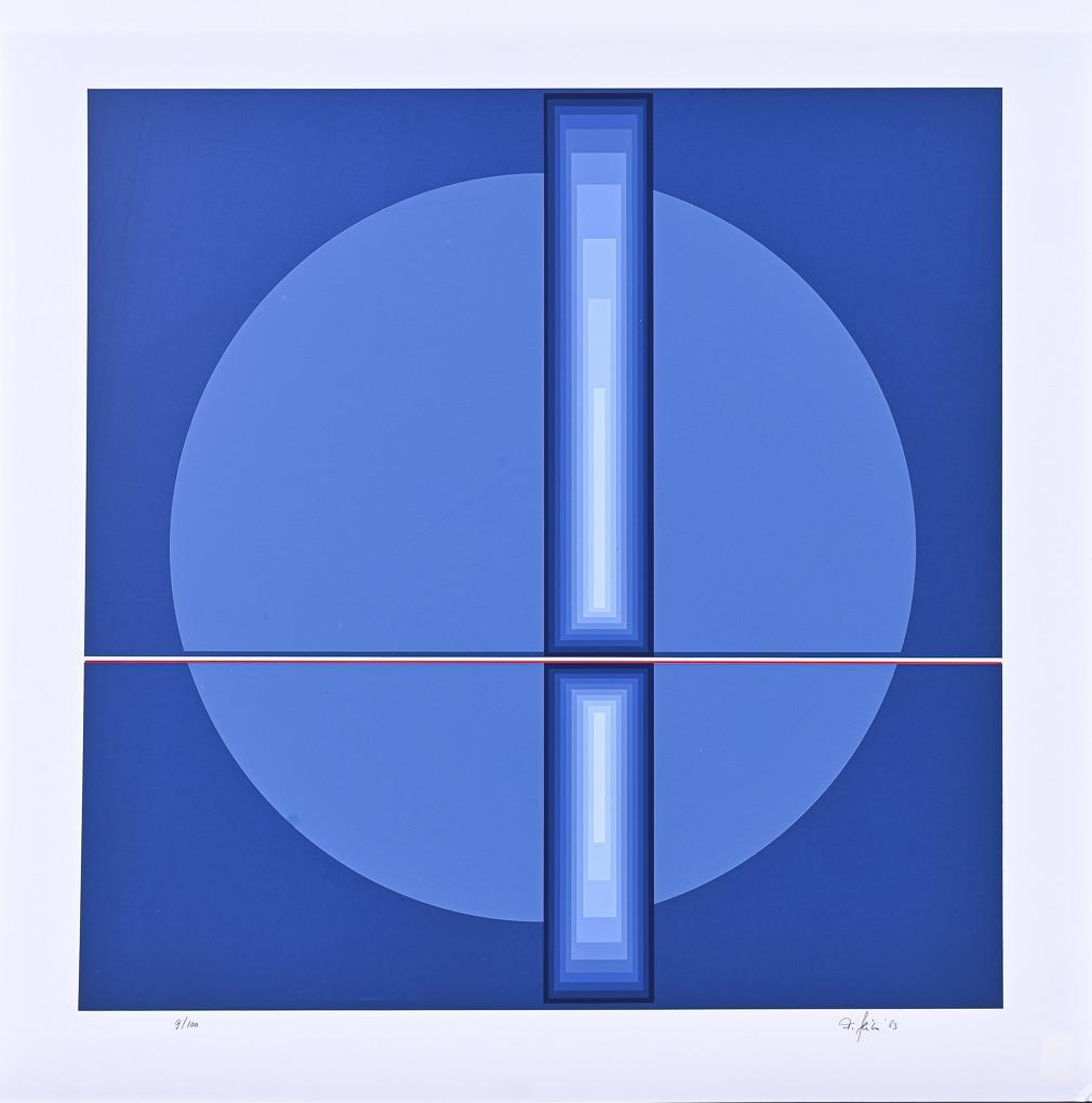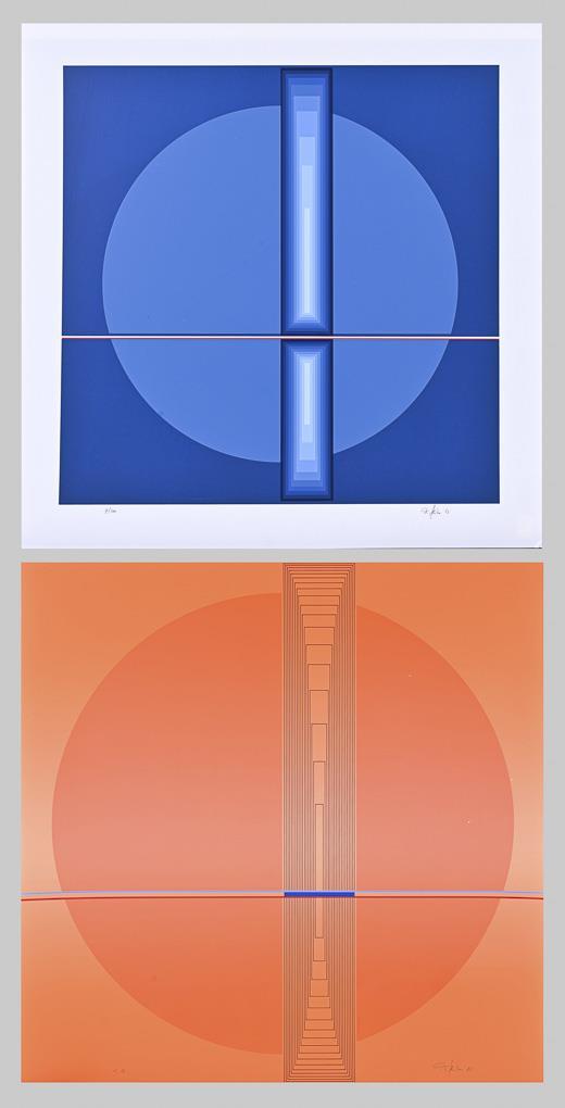 Komposition in Blau, Blatt: 60 x 60 cm, Exemplar: 9/100, [19]83, Ecke unten rechts bestoßen | Komposition in Orange, Blatt: 57 x 57 cm, Künstlerexemplar - "e.a.", [19]85, Oberfläche mit 3 kleinen weißen Flecken.