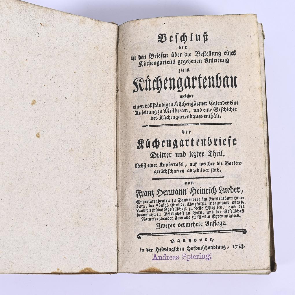 "Der Küchengartenbriefe Dritter und letzter Theil". 560 Seiten und eine Tafel. Im Pappeinband mit Grünschnitt. Altersgemäßer, guter Zustand.