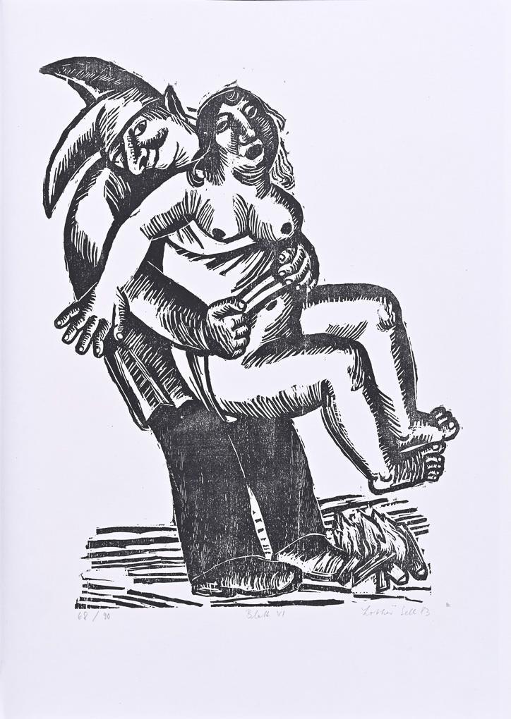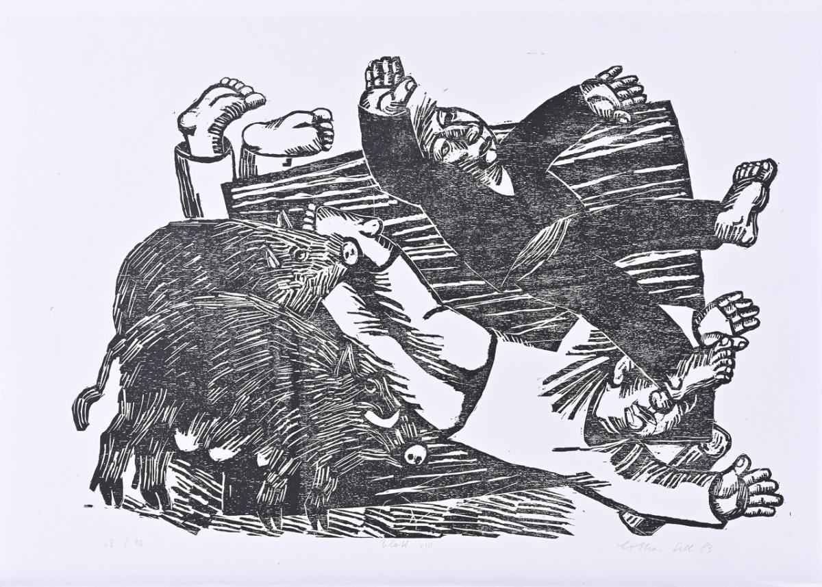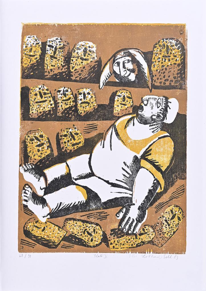Vollständiges Künstlerwerk mit 10 nummerierten Holzschnitten und 1 Titelblatt mit Illustrationen zu den Geschichten Till Eulenspiegels; herausgegeben von Manfred Schmidt, Edition des Staatlichen Kunsthandels der DDR, 1983; in originaler Mappe mit eingeklebtem Inhaltsverzeichnis. Blätter minimal griffspurig.