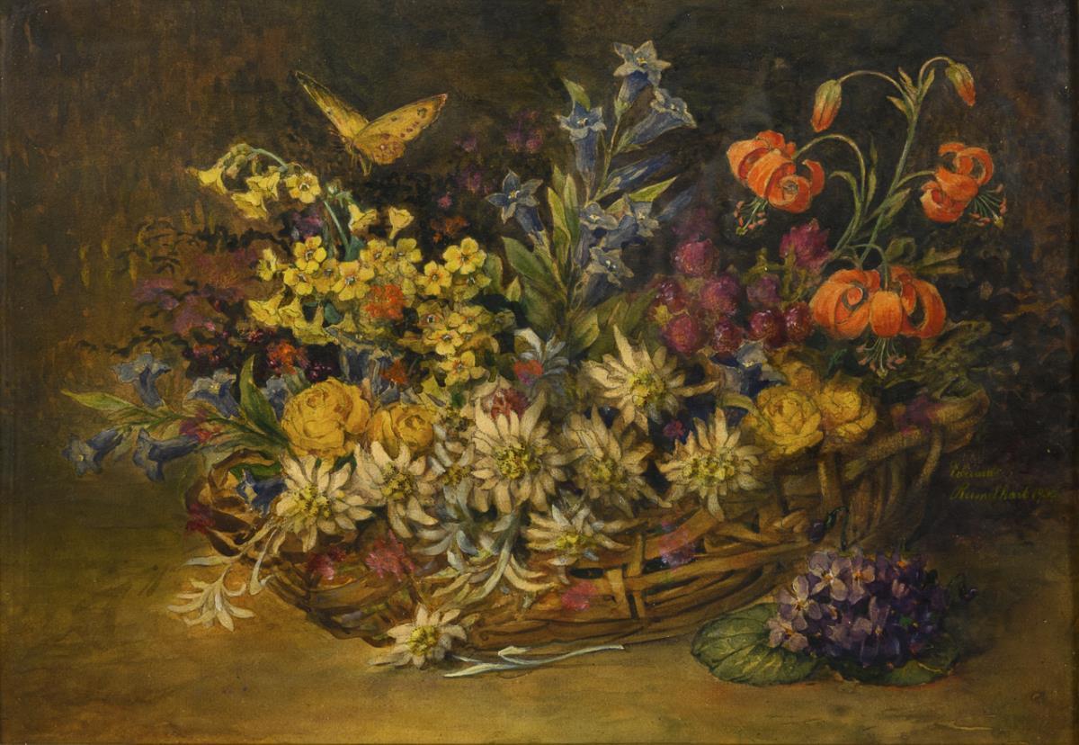 Geflochtener Korb mit verschiedenen Blumen und einem Schmetterling.