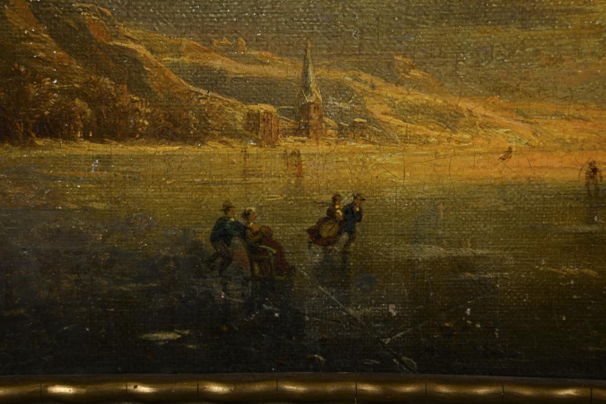 Eisläufer auf dem See nahe der Stadt in der Abendsonne. Im Himmel retuschiert.