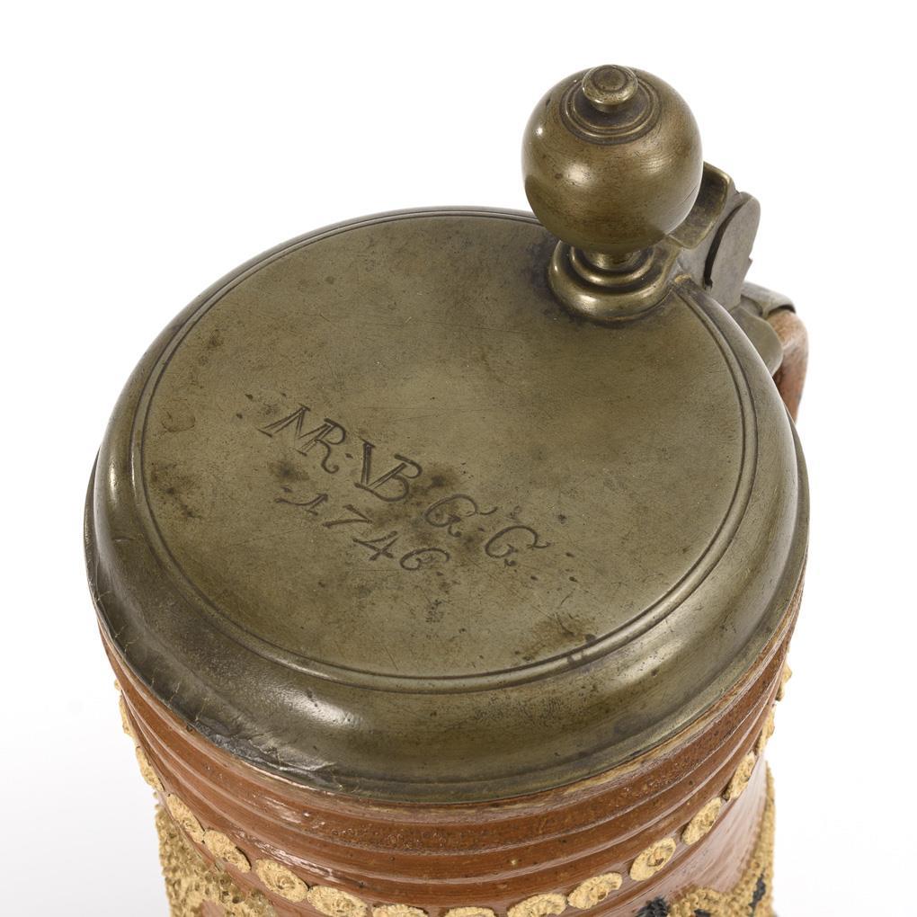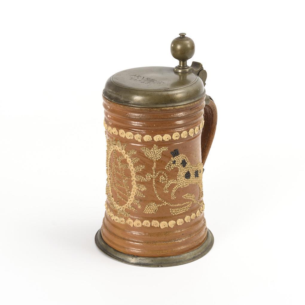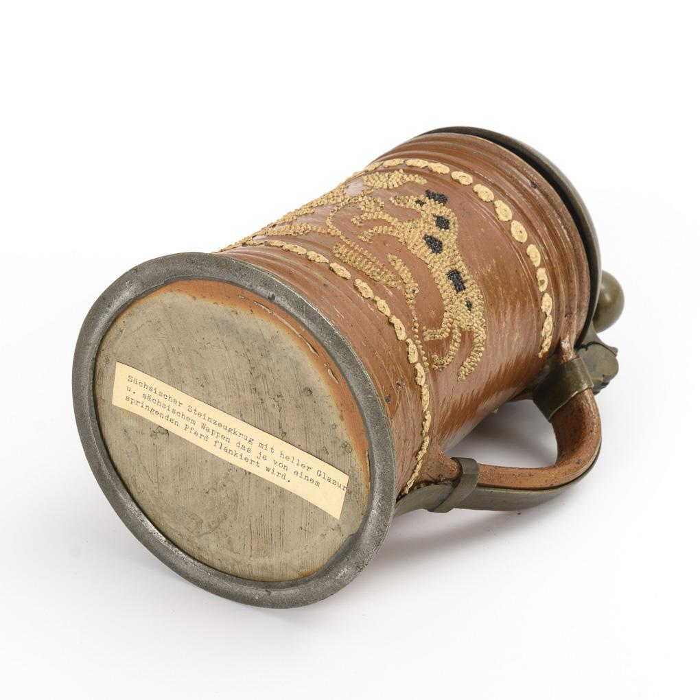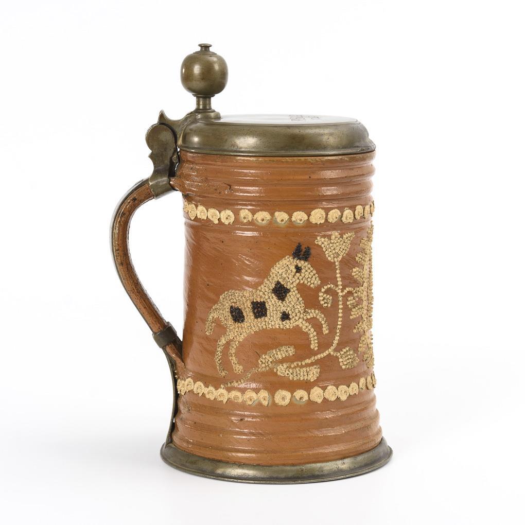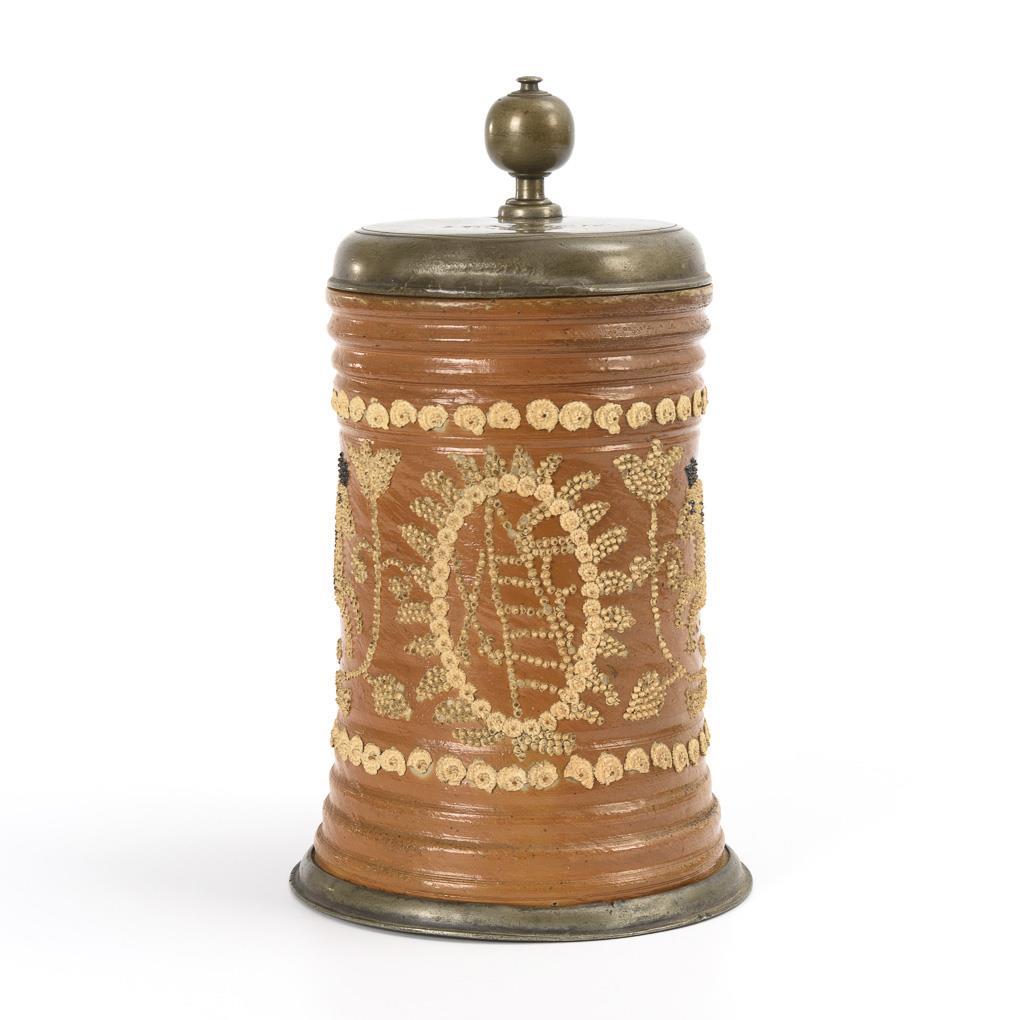 Barocker Walzenkrug mit Bandhenkel. Gurtfurchen, florale Auflagenzier, aus Perlen zusammengesetzter Bildschmuck des sächsischen Wappens flankiert von springenden Pferden und Blumen, teils schwarz gefärbt. Zinnmontierung mit Kugelknauf, graviert "MR VB GG 1746", gepunzt Daniel Eilefeld, Hirschberg. Defekte an den Tonauflagen, Fehlstellen am Zinn.