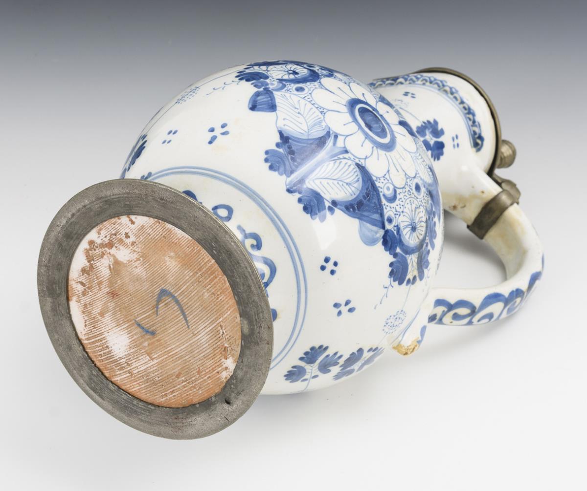 Kugelbauchkrug mit Rundfuß und spiralverziertem Bandhenkel. Wandung mit zwei großen Blumenbuketts und einem kleinen Vogel. Zinndeckel mit Urnendrücker, graviert "INF", Zinnstandring. Leichte Glasurbereibungen und -bestoßungen, am Stand bestoßen.