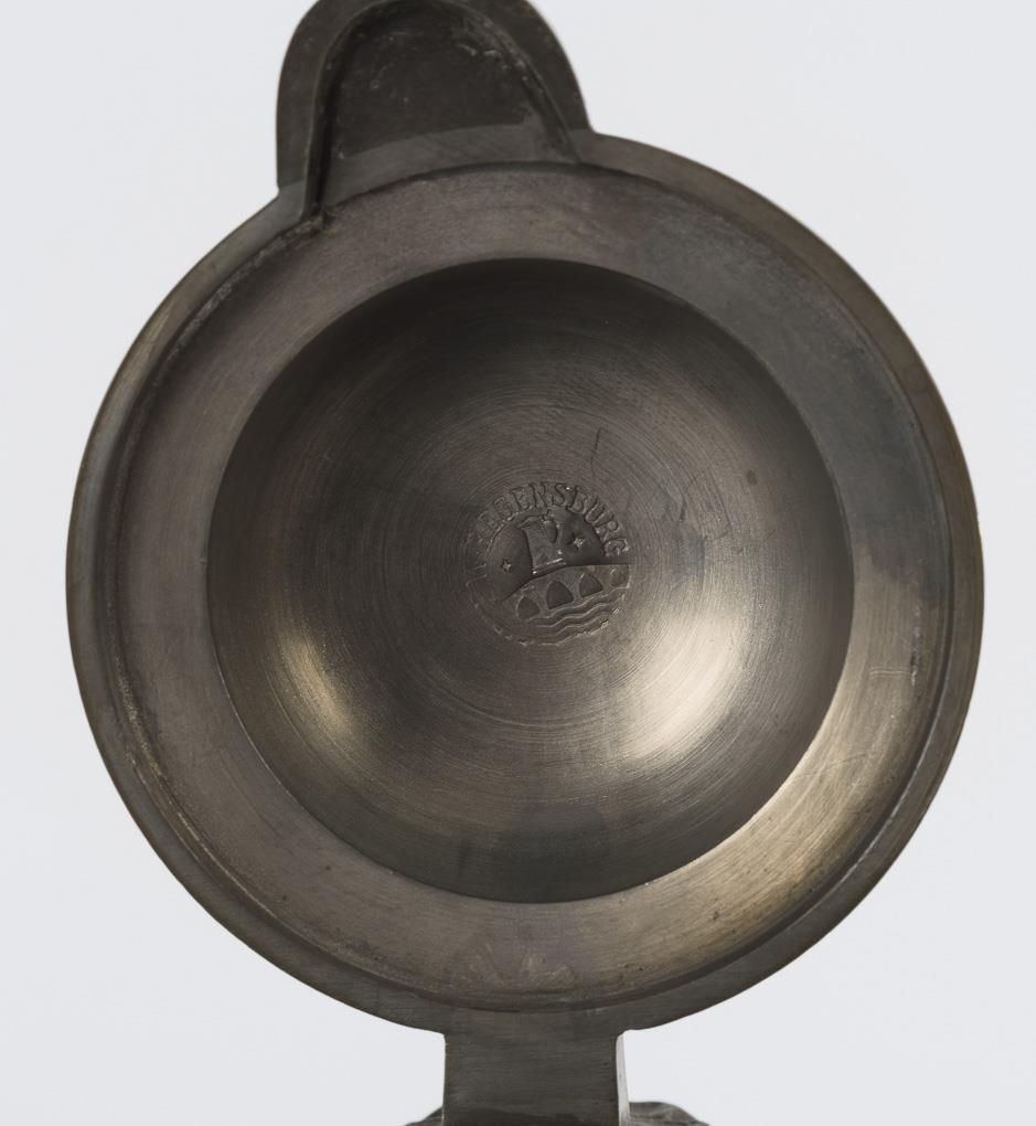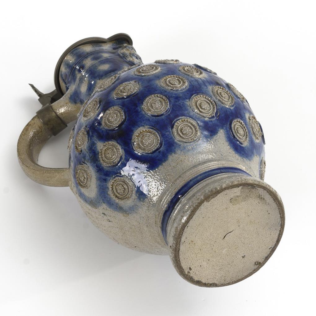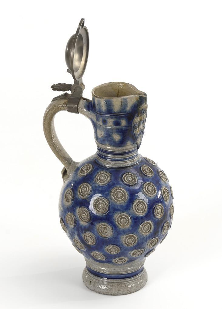 Enghalskanne mit Kugelbauch und 7 Reihen aufgelegter Rosetten, abgesetzter Hals mit Löwenfratze und abgesetzter Rundstand, gekehlter Bandhenkel mit eingerolltem Ansatz. Ergänzter Zinndeckel mit Muscheldrücker, gepunzt. Am Henkel leicht bestoßen, Mündung und unterer Henkelansatz fein rissig.