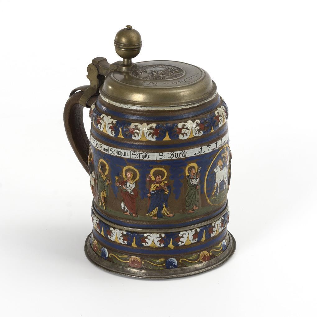 Zylinderkrug mit bemaltem Ohrenhenkel. Wandung mit umlaufend reliefierten Blattfriesen und einem Figurenfries mit den bezeichneten Aposteln, mittig ein Rundmedaillon mit dem Lamm Gottes, datiert "1711". Zinndeckel mit Kugeldrücker, Reliefmedaillon mit Reiterbild Karls XII, graviert "APM HLH 1717", Zinnstandring und Zinnring. Wandung leicht berieben, kleiner Mündungschip, Zinn mit Fehlstellen und Defekten.