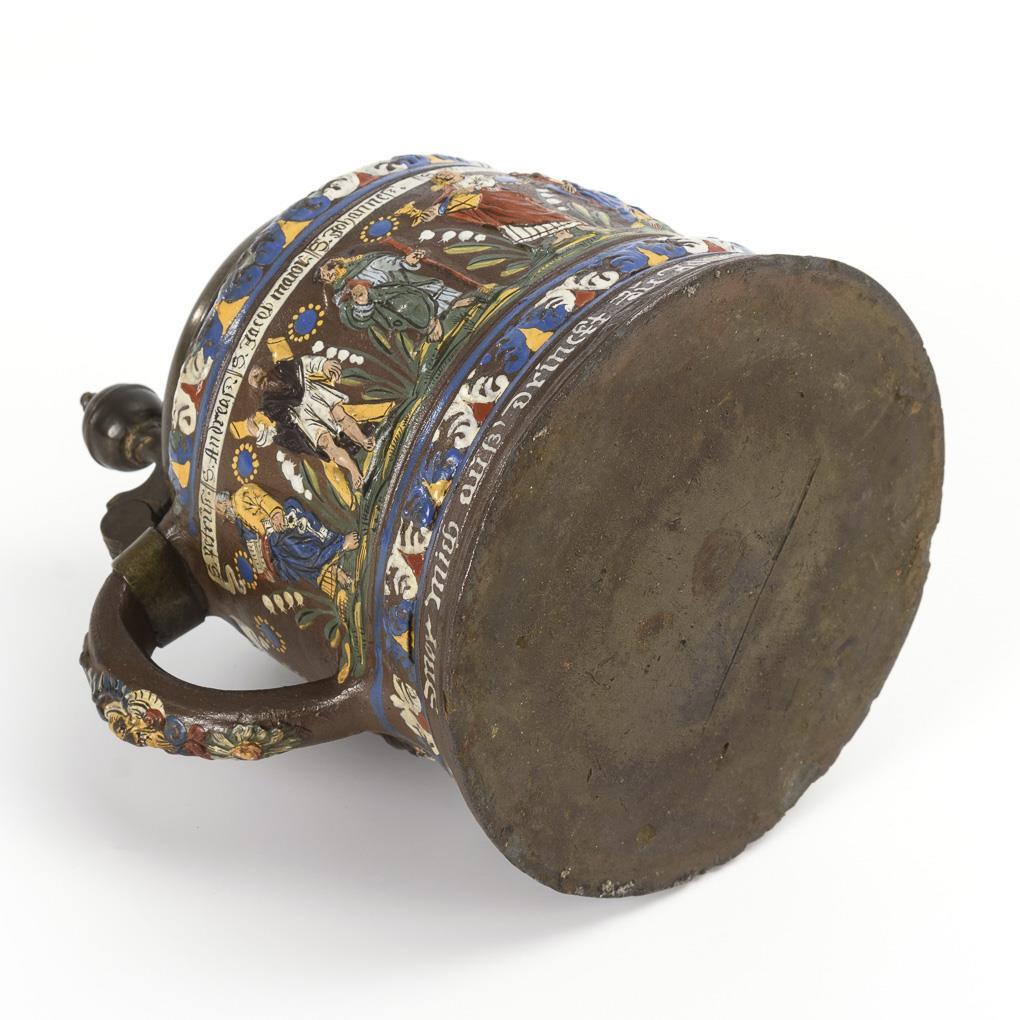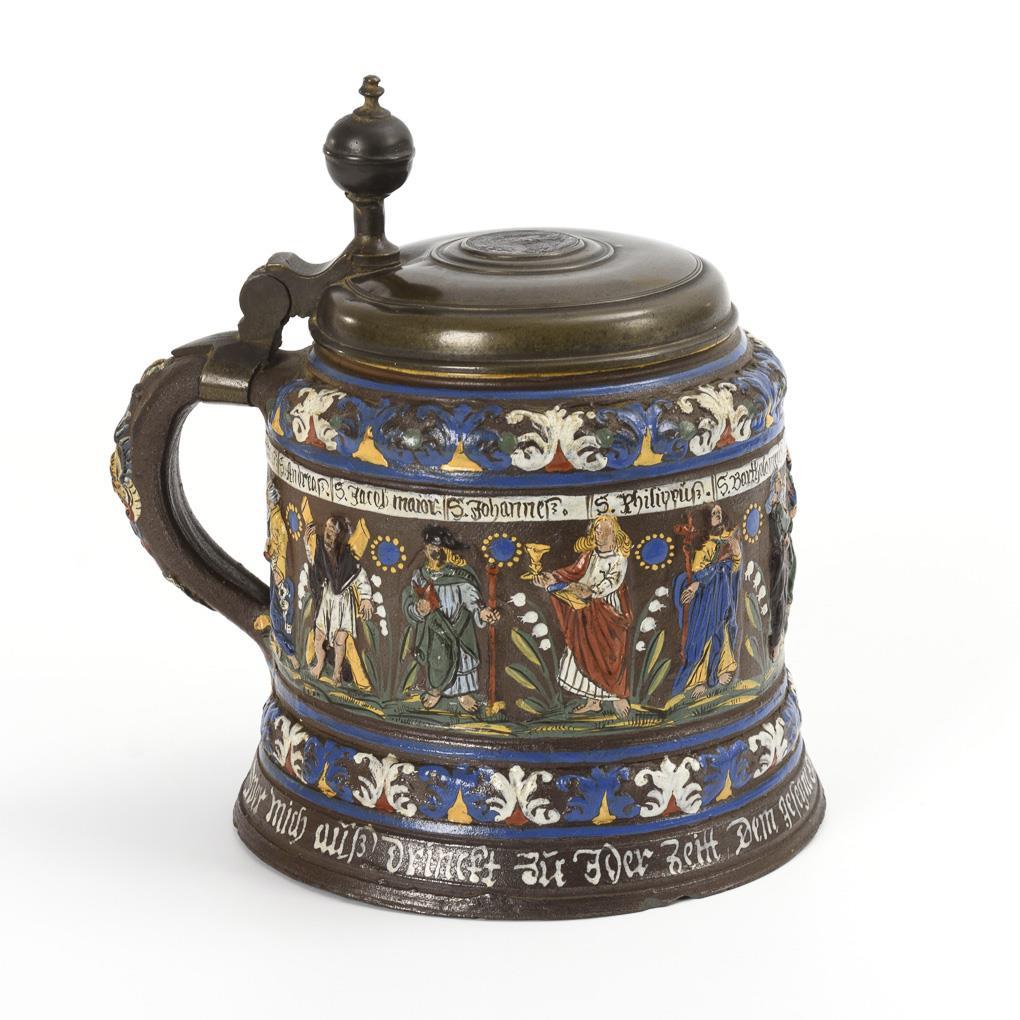 Zylinderkrug mit reliefverziertem Ohrenhenkel. Wandung mit umlaufend reliefierten Blattfriesen und einem Figurenfries mit den bezeichneten Aposteln, am leicht ausgestellten Sockel ein Trinkspruch, datiert "1687". Zinndeckel mit Kugeldrücker und Reliefmedaillon mit Heiligenbild, innen graviert "MJJ". Bestoßungen am Stand, leicht berieben.