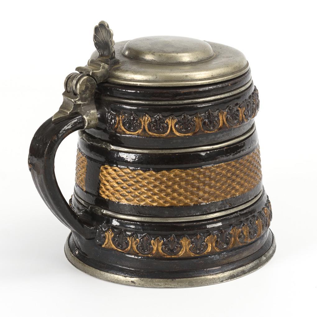 Konische Zylinderform mit leicht profiliertem Bandhenkel, mittig umlaufendes Netzwerkband, gewulstete Blattfriese. Zinndeckel mit Muscheldrücker, Zinnwandungsringe, Zinnstandring, gepunzt mit Stadtmarke Altenberg oder Annaberg, Meistermarke BS. Lippe mit Ausbruch, feine Mündungsrisse, Zinn mit Löt- und Gebrauchsspuren.