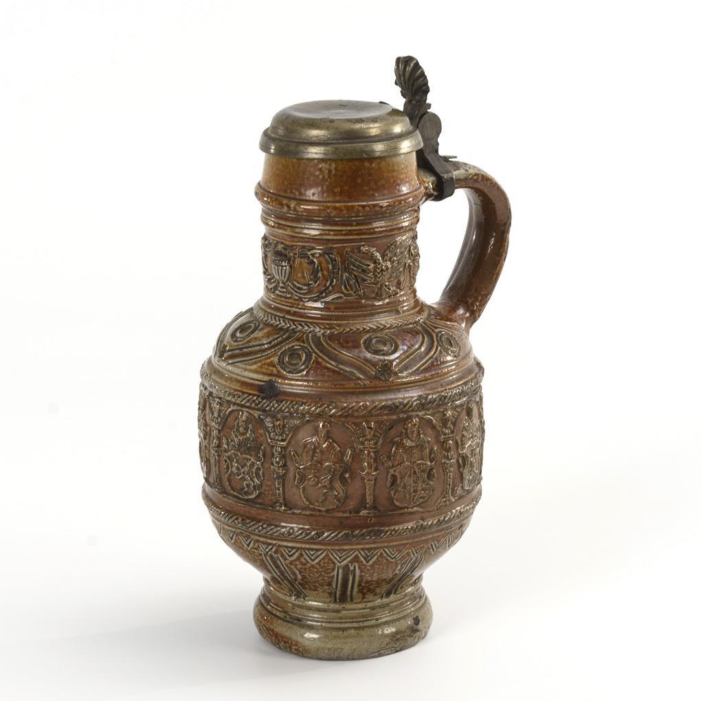 Mittelfrieskrug mit abgesetztem Hals und Stand, spitz auslaufender Ohrenhenkel. Adlerfries, eingepresste Ornamente und zentraler Arkadenfries mit der Darstellung der 7 Kurfürsten. Zinndeckel mit Muscheldrücker. Partiell bestoßen, Henkel fein rissig, feiner Wandungsriss.