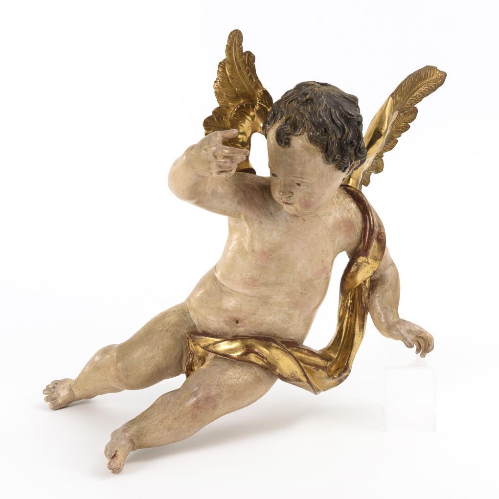 Vollplastisch gestalteter Engel mit flatterndem Lendentuch, der schwebend in die Höhe weist. 1 Finger und 2 Zehen geklebt, Fassung großteils übergangen, Vergoldung berieben, sonst geringe Alters-/Gebrauchsspuren.