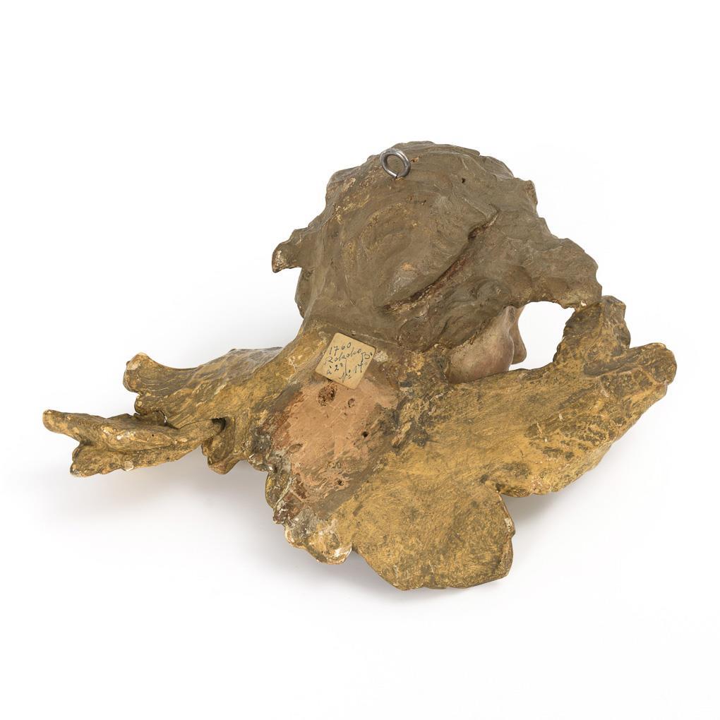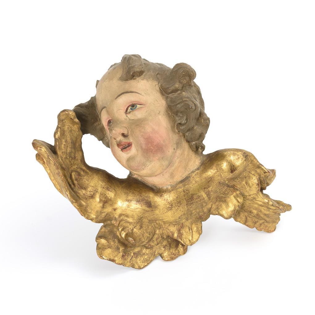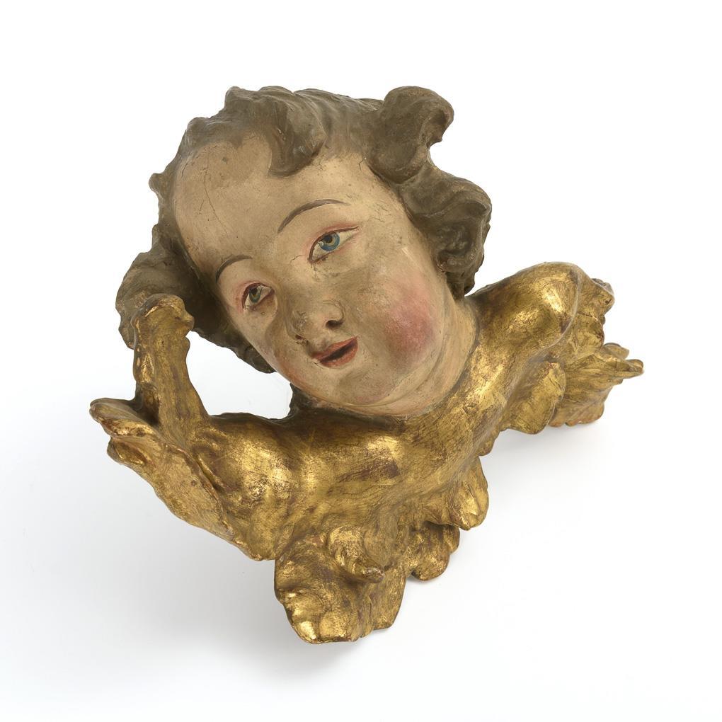 Verzückt in die Höhe blickende Engelsflüchte. Fehlstelle an der Hinterkopf-Leimfuge, einige Alters-/Gebrauchsspuren.