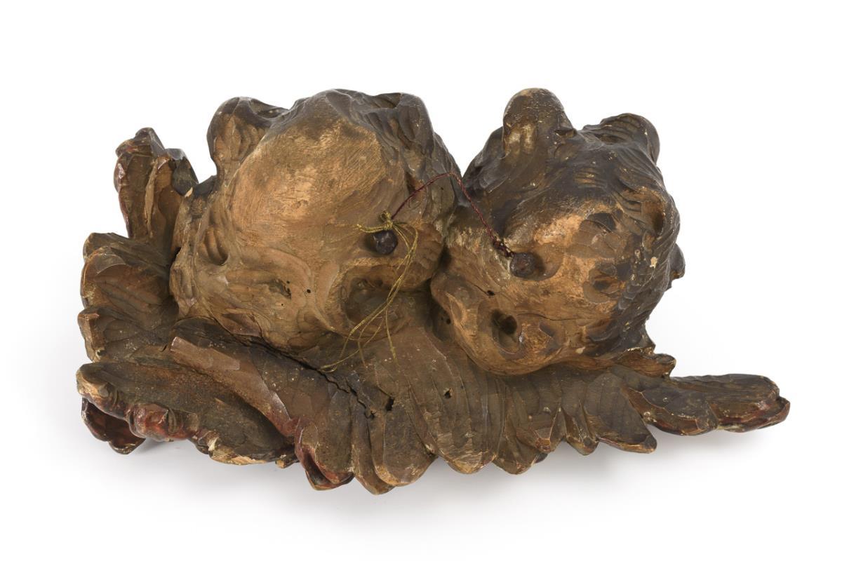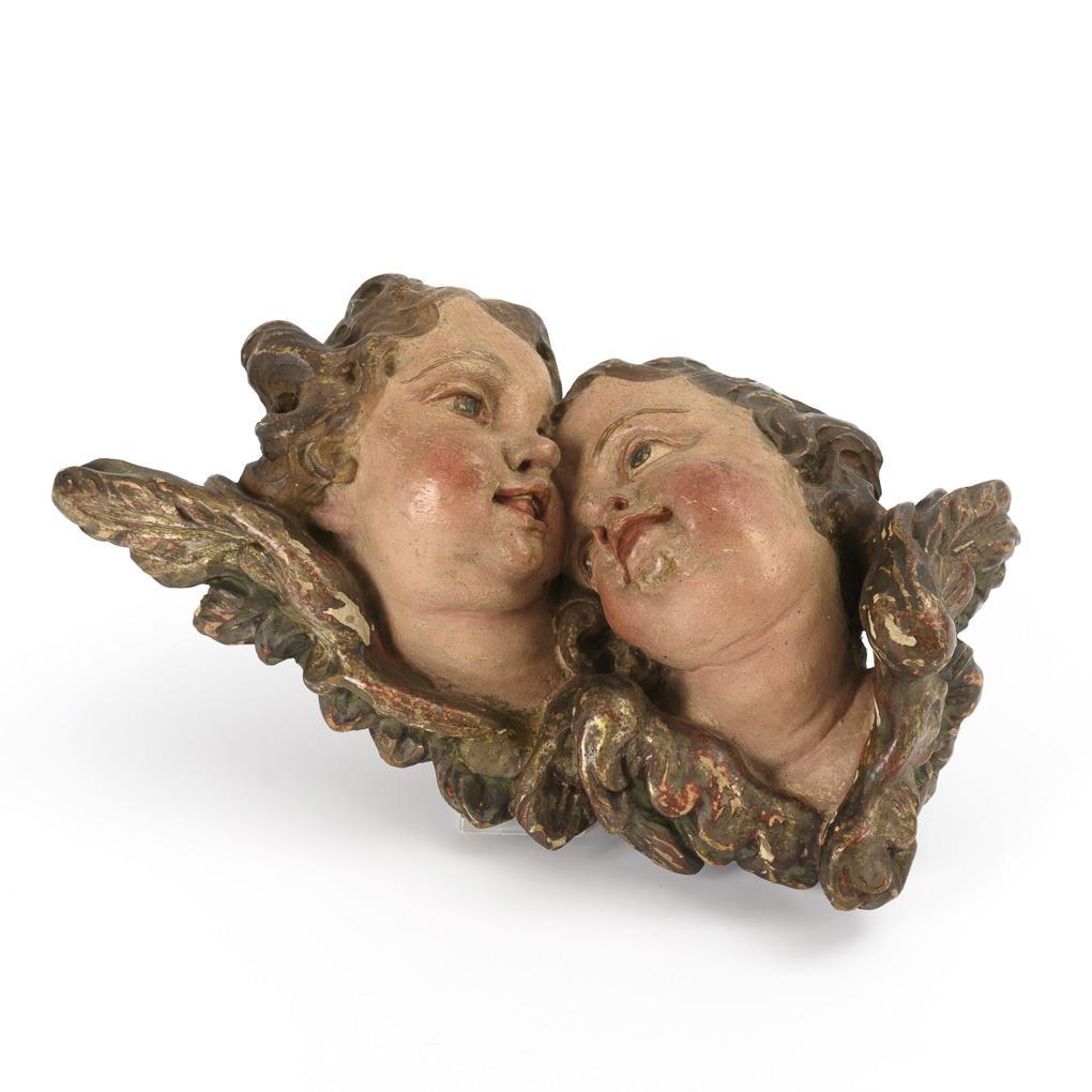Aus einem Stück geschnitztes Paar Engelsflüchte, die sich aneinanderschmiegen. Teils retuschiert, einige wenige Alters-/Gebrauchsspuren.
