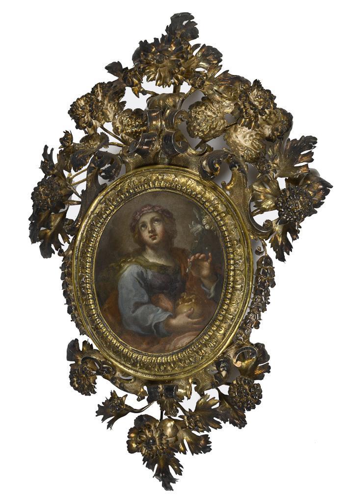 Öl/Kupfer. Unsigniert, Rahmen ungepunzt. 18. Jh. 14 x 11,5 cm. Gerahmt: 39 x 25 cm. Maria Magdalena mit Schädel und Lilie und zum Himmel erhobenem Blick. Minimale Altersspuren.